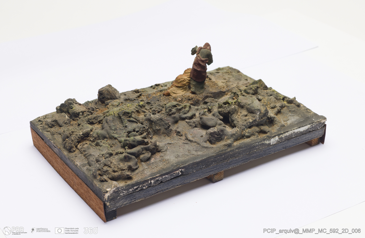 Matéria/Técnica: Barro branco e vermelho modelado, sobre base de madeira. Pintura a frio polícroma: castanho, verde escuro, amarelo, vermelho e azul; Cronologia: 1911; Autoria: Francisco Elias / Caldas da Rainha, Portugal; Dimensões (cm): Altura: 8; Largura: 15; Comprimento: 22 base 1,5x15x22.