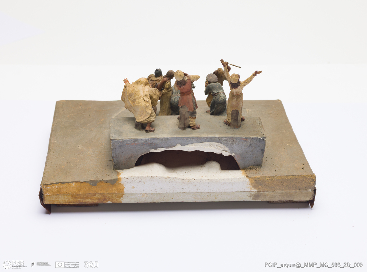 Matéria/Técnica: Barro branco modelado, sobre base de madeira. Pintura a frio polícroma: castanho, vermelho, azul; Cronologia: 1911; Autoria: Francisco Elias / Caldas da Rainha, Portugal; Dimensões (cm): Altura: 12; Largura: 22.