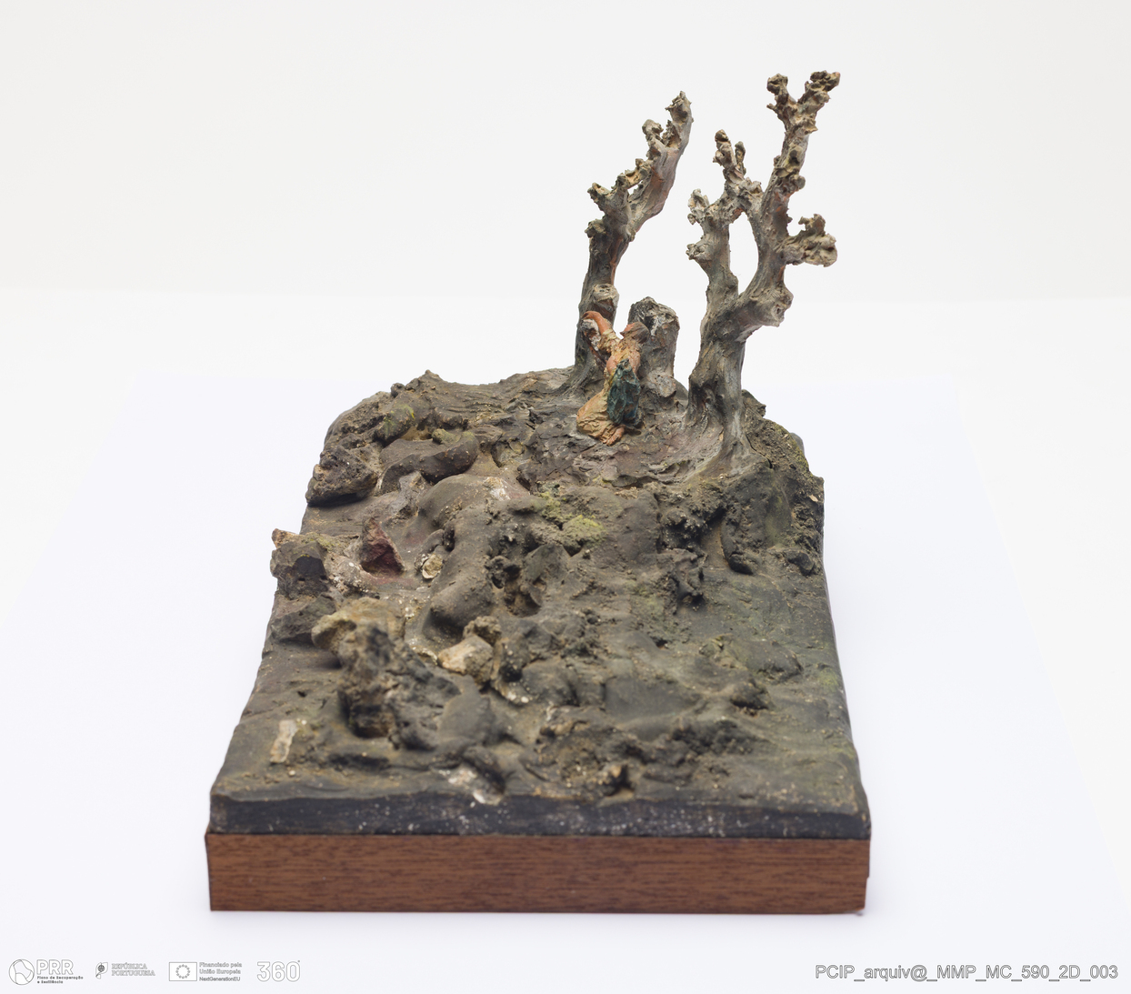 Matéria/Técnica: Barro branco e vermelho modelado, sobre base de madeira. Pintura a frio polícroma: castanho, amarelo e verde; Cronologia: 1911; Autoria: Francisco Elias / Caldas da Rainha, Portugal; Dimensões (cm): Altura: 15; Largura: 14,5; Comprimento: 23 base 1,5x15x23.