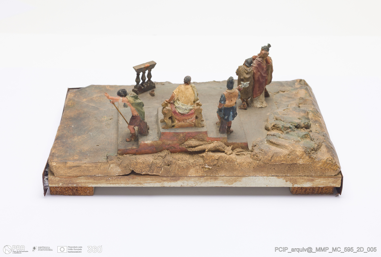 Matéria/Técnica: Barro vermelho modelado, sobre base de madeira. Pintura a frio polícroma: castanho, cinzento, amarelo, azul, vermelho escuro, verde claro e branco; Cronologia: 1911; Autoria: Francisco Elias / Caldas da Rainha, Portugal; Dimensões (cm): Altura: 9; Largura: 15; Comprimento: 22.