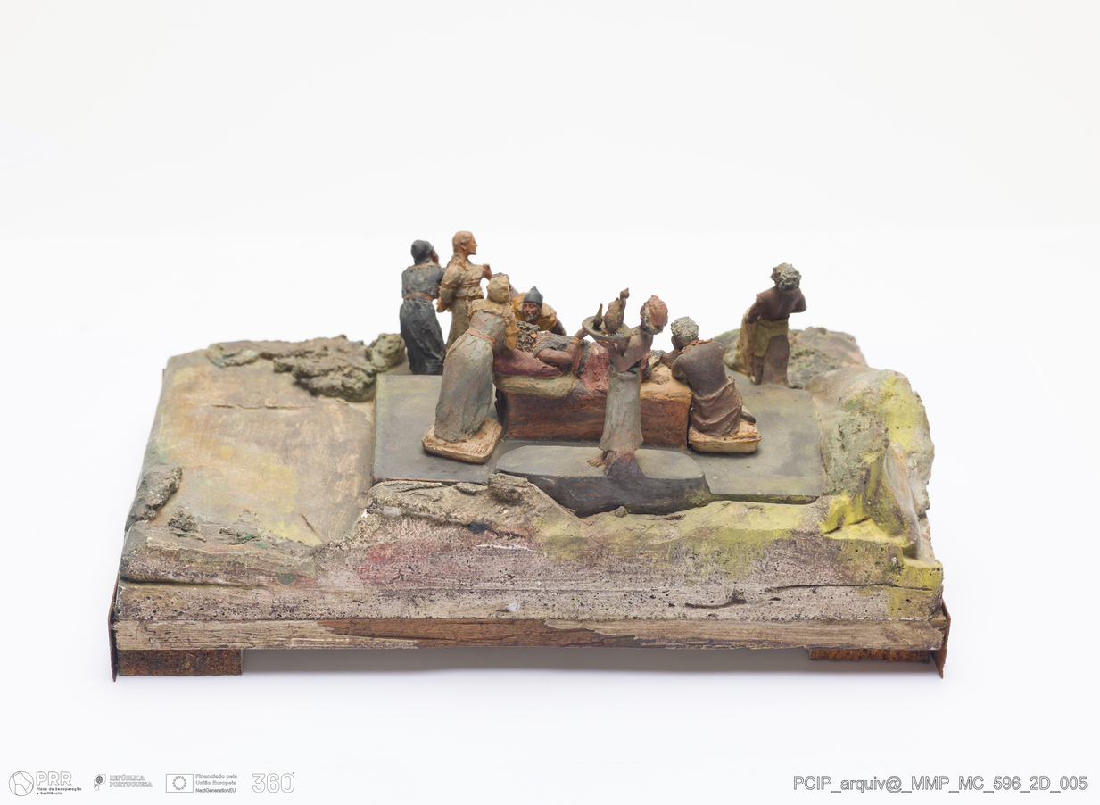 Matéria/Técnica: Barro branco modelado, sobre base de madeira. Pintura a frio polícroma:; Cronologia: 1911; Autoria: Francisco Elias / Caldas da Rainha, Portugal; Dimensões (cm): Altura: 12; Largura: 15; Comprimento: 22.