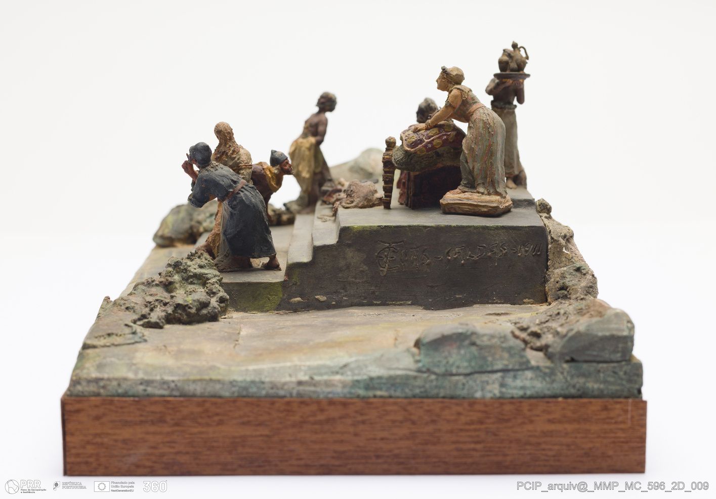 Matéria/Técnica: Barro branco modelado, sobre base de madeira. Pintura a frio polícroma:; Cronologia: 1911; Autoria: Francisco Elias / Caldas da Rainha, Portugal; Dimensões (cm): Altura: 12; Largura: 15; Comprimento: 22.