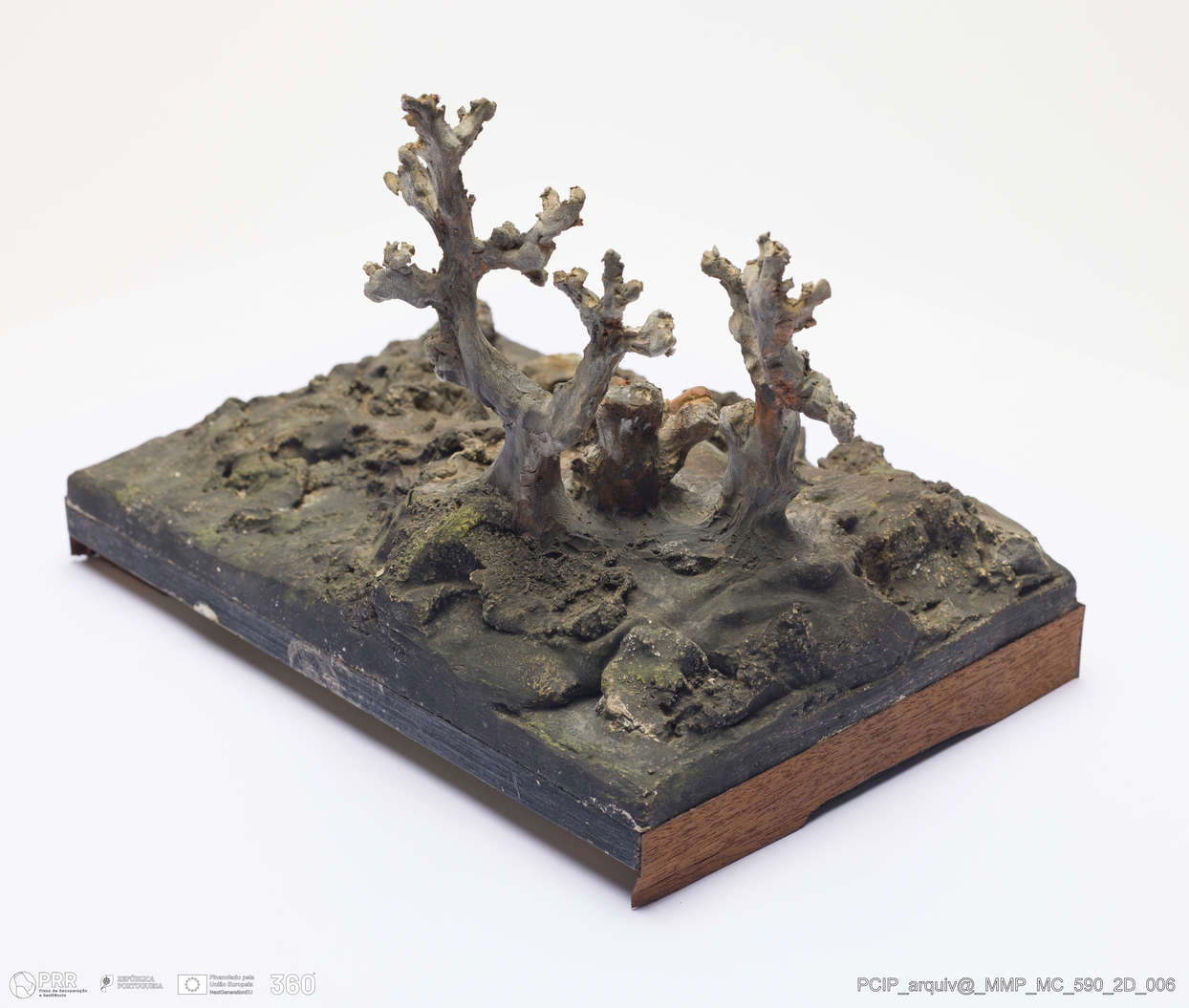 Matéria/Técnica: Barro branco e vermelho modelado, sobre base de madeira. Pintura a frio polícroma: castanho, amarelo e verde; Cronologia: 1911; Autoria: Francisco Elias / Caldas da Rainha, Portugal; Dimensões (cm): Altura: 15; Largura: 14,5; Comprimento: 23 base 1,5x15x23.