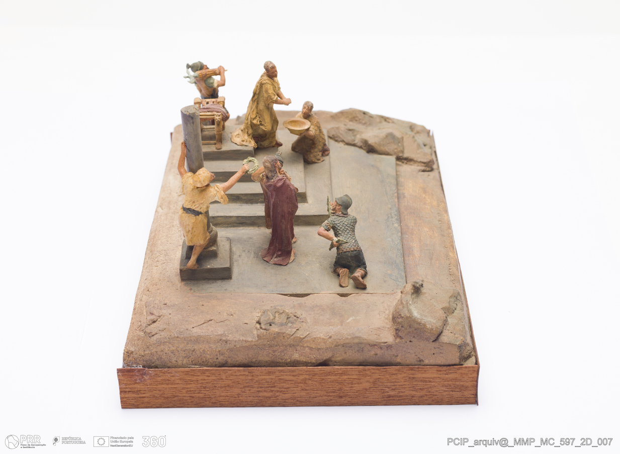 Matéria/Técnica: Barro branco modelado, sobre base de madeira. Pintura a frio polícroma:; Cronologia: 1911; Autoria: Francisco Elias / Caldas da Rainha, Portugal; Dimensões (cm): Altura: 22; Comprimento: 15.