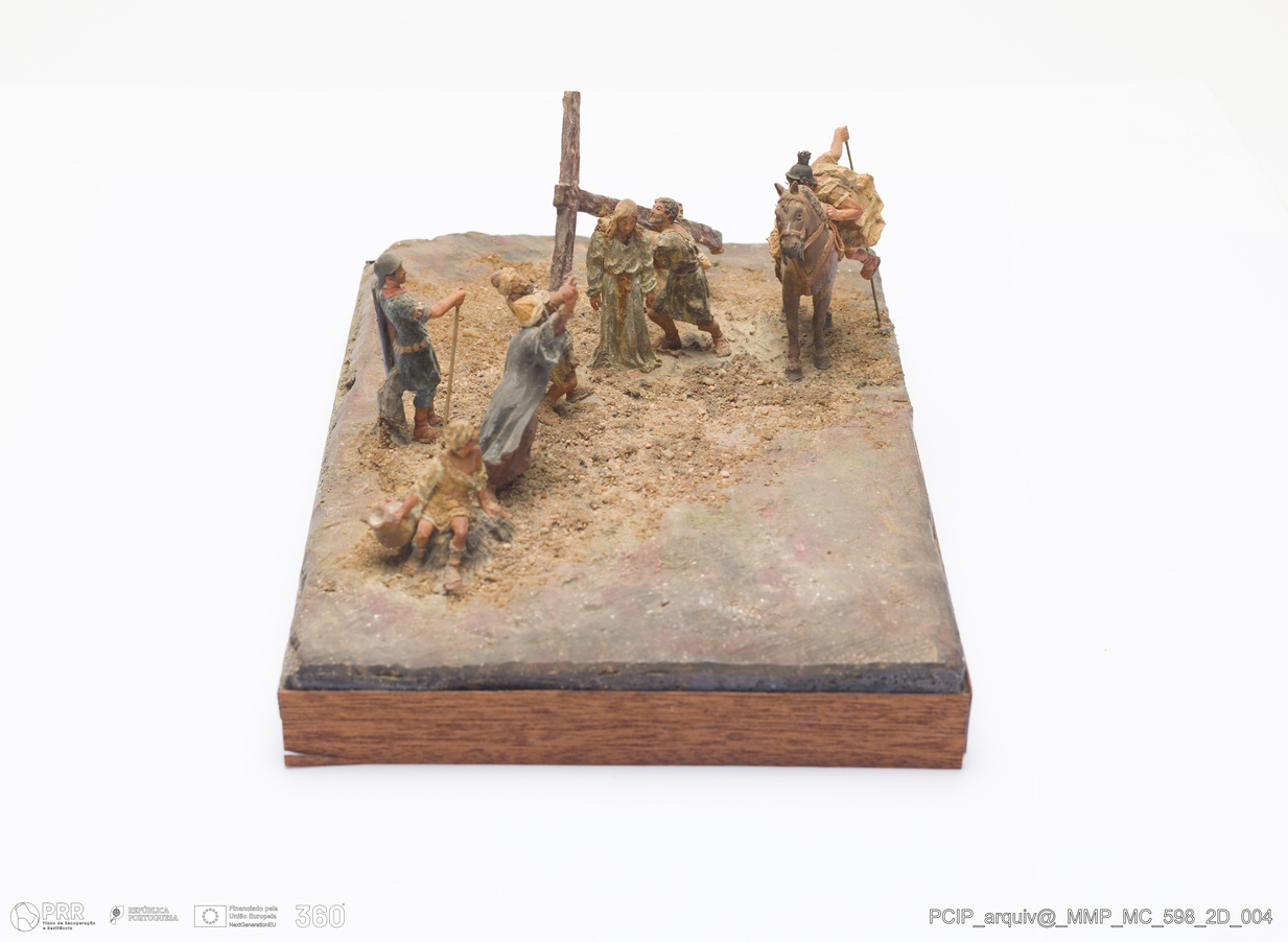 Matéria/Técnica: Barro branco modelado, sobre base de madeira. Pintura a frio polícroma:; Cronologia: 1911; Autoria: Francisco Elias / Caldas da Rainha, Portugal; Dimensões (cm): Altura: 10; Comprimento: 25.