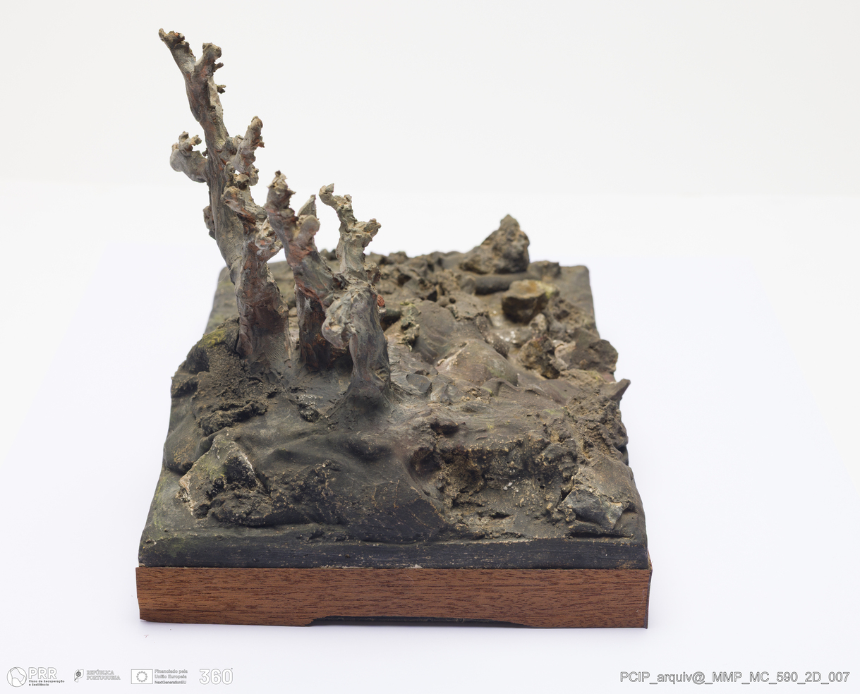 Matéria/Técnica: Barro branco e vermelho modelado, sobre base de madeira. Pintura a frio polícroma: castanho, amarelo e verde; Cronologia: 1911; Autoria: Francisco Elias / Caldas da Rainha, Portugal; Dimensões (cm): Altura: 15; Largura: 14,5; Comprimento: 23 base 1,5x15x23.