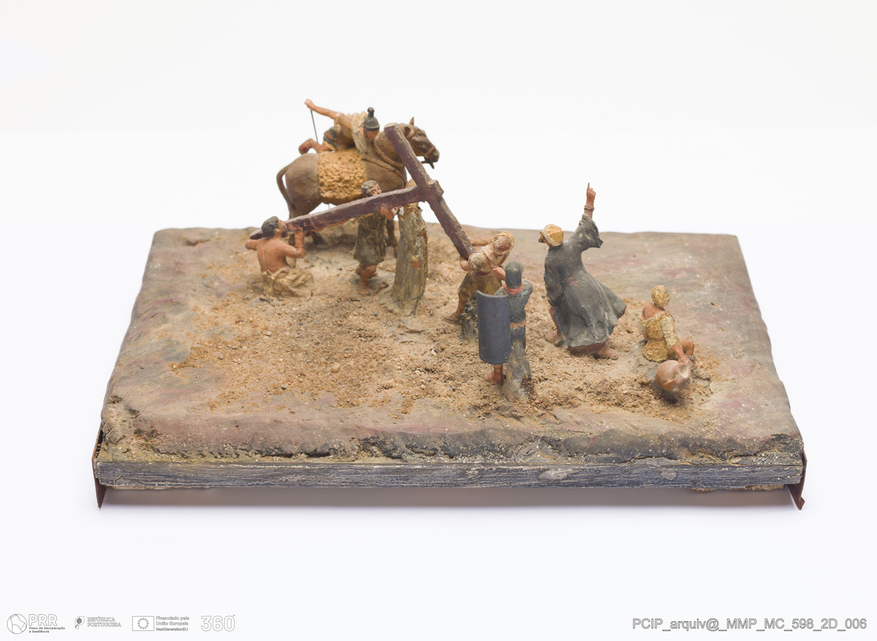 Matéria/Técnica: Barro branco modelado, sobre base de madeira. Pintura a frio polícroma:; Cronologia: 1911; Autoria: Francisco Elias / Caldas da Rainha, Portugal; Dimensões (cm): Altura: 10; Comprimento: 25.