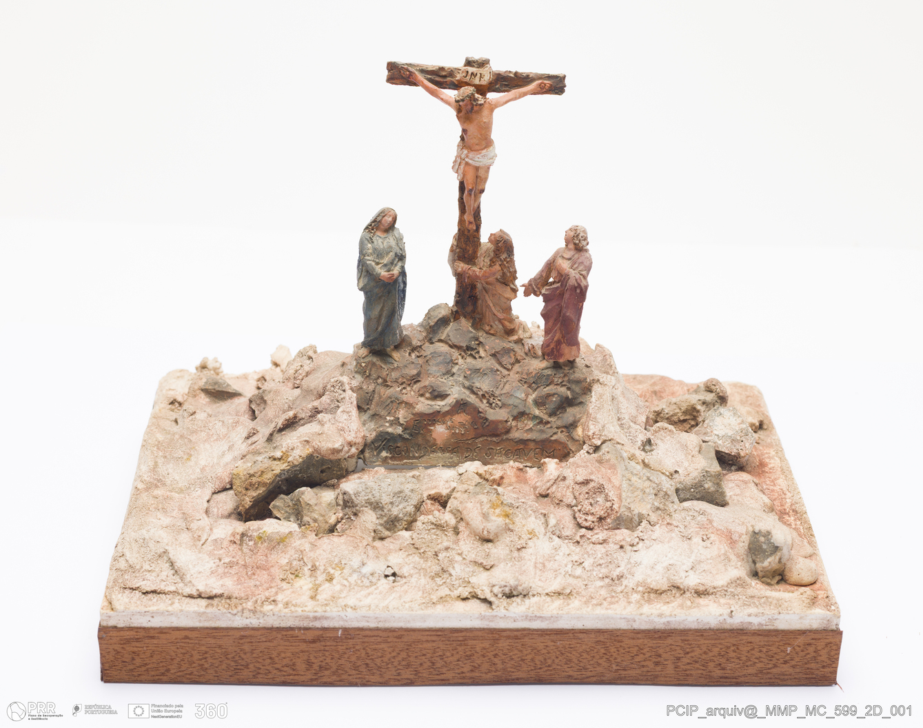 Matéria/Técnica: Barro branco modelado, sobre base de madeira. Pintura a frio polícroma: azul, branco, vermelho escuro e castanho; Cronologia: 1911; Autoria: Francisco Elias / Caldas da Rainha, Portugal; Dimensões (cm): Altura: 15; Comprimento: 22.