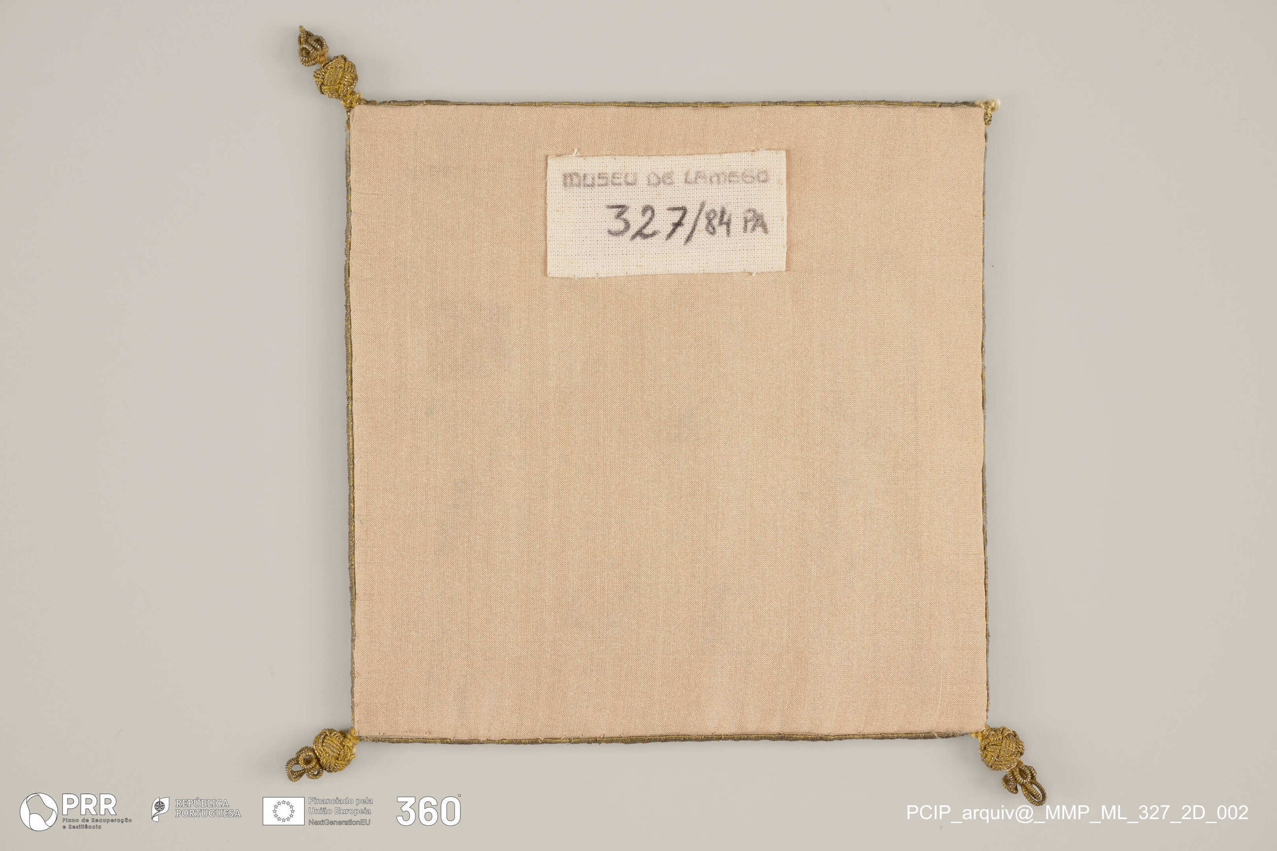 Matéria/Técnica: Bordado: fio de ouro semi-matizado (efeito rede), cordão de fio de ouro Aplicação de galão e borlas em passemanaria; Cronologia: Século XVIII; Autoria: Desconhecida; Dimensões (cm): Altura: 18 cm x Largura: 18 cm.