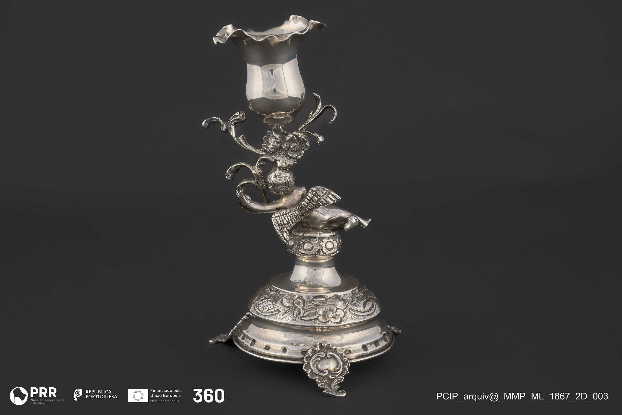 Matéria/Técnica: Prata fundida, relevada e incisa.; Cronologia: 1891-1900; Autoria: Soares, Joaquim Pinto (ourives); Dimensões (cm): Altura: 18,5 x Diâmetro: b. 9.