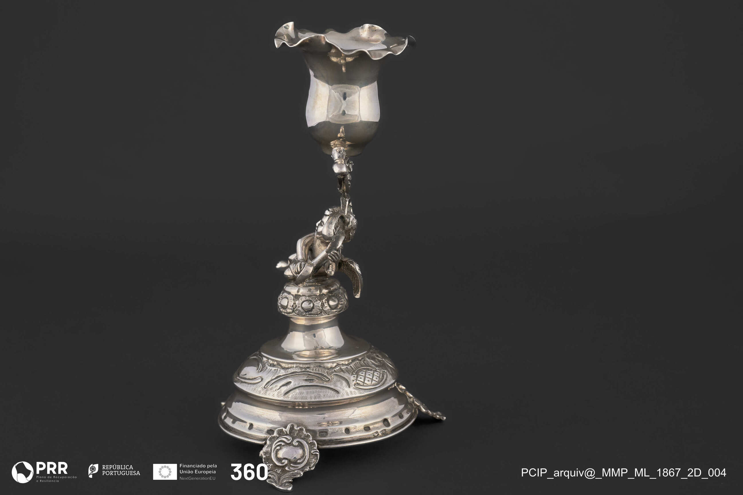 Matéria/Técnica: Prata fundida, relevada e incisa.; Cronologia: 1891-1900; Autoria: Soares, Joaquim Pinto (ourives); Dimensões (cm): Altura: 18,5 x Diâmetro: b. 9.