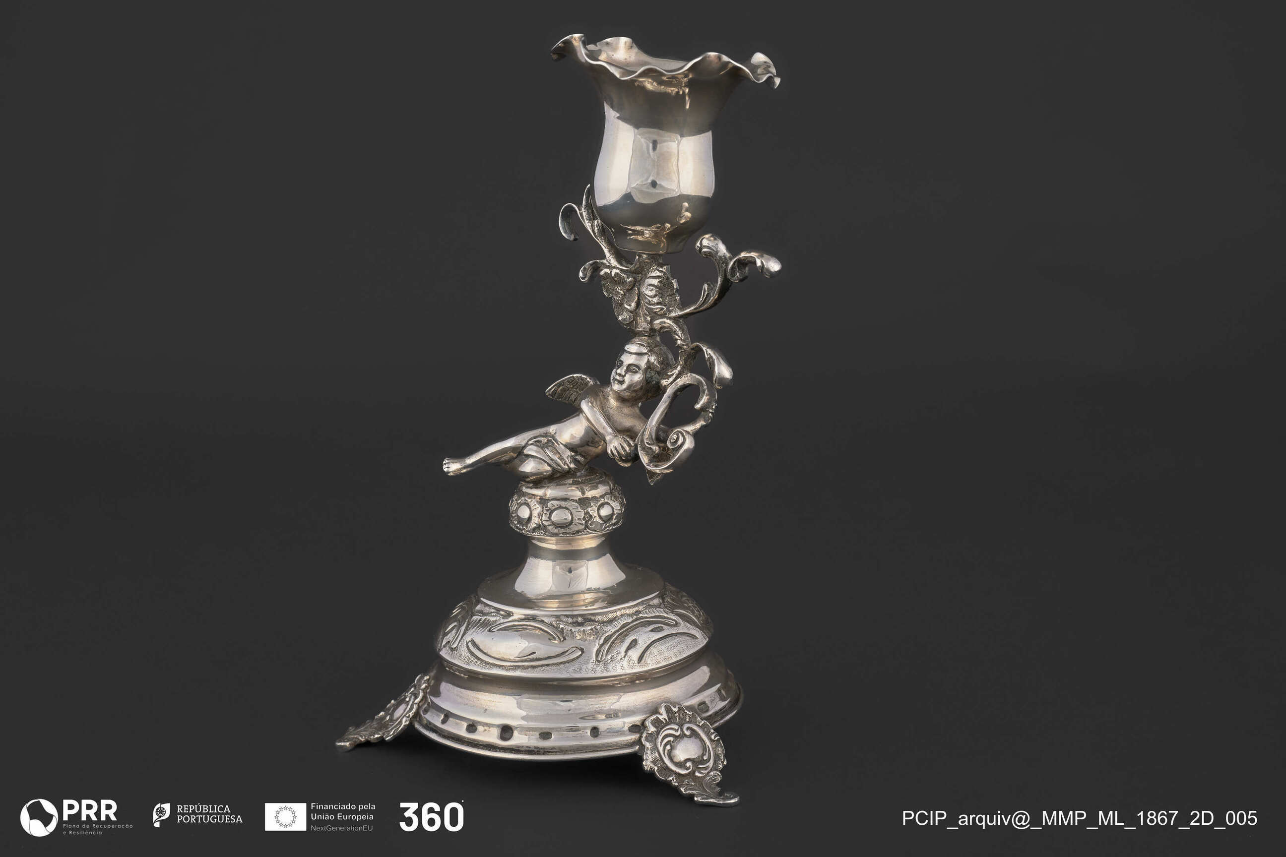Matéria/Técnica: Prata fundida, relevada e incisa.; Cronologia: 1891-1900; Autoria: Soares, Joaquim Pinto (ourives); Dimensões (cm): Altura: 18,5 x Diâmetro: b. 9.