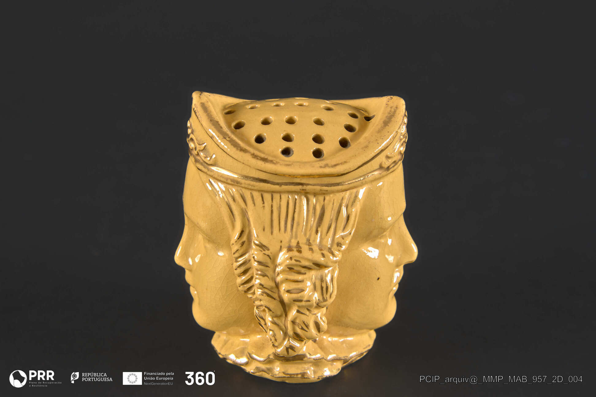Matéria/Técnica: Peça em faiança moldada, vidrada e pintada; Cronologia: Desconhecida; Autoria: Desconhecida; Dimensões: Desconhecidas.