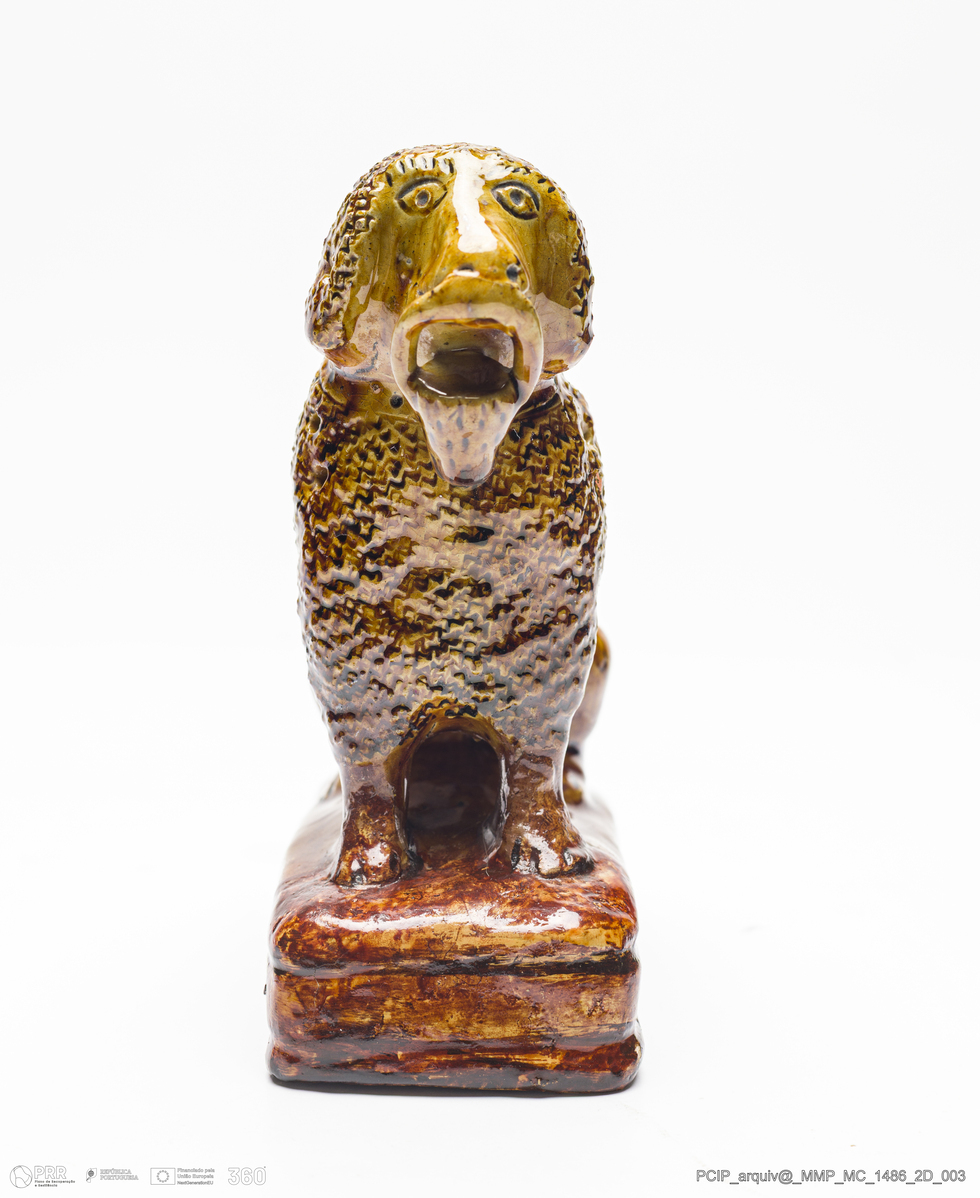 Matéria/Técnica: Barro moldado. Vidrado monocromo castanho de manganês; Cronologia: 1850-1870; Autoria: Manuel Cipriano Gomes Mafra / Fábrica Manuel Cipriano Gomes O Mafra, Caldas da Rainha, Portugal; Dimensões (cm): Altura: 13; Largura: 6; Comprimento: 11.