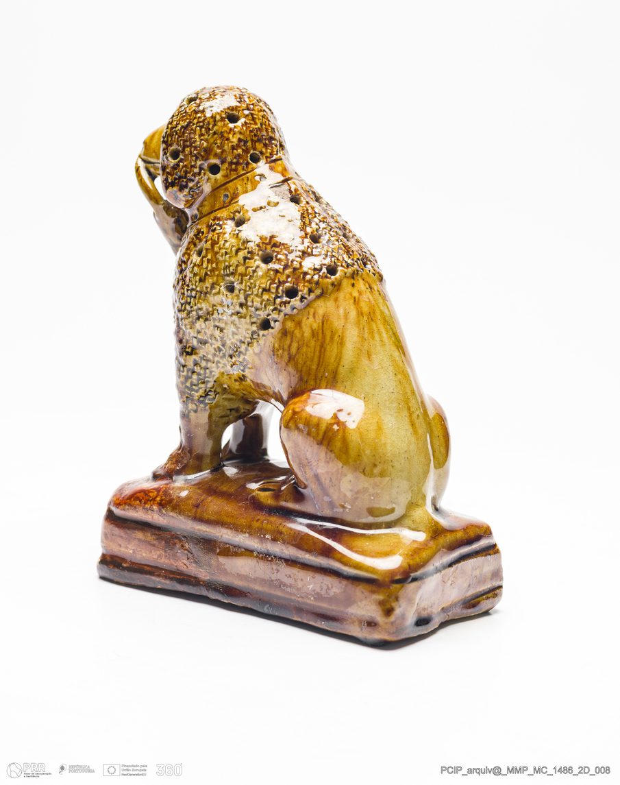 Matéria/Técnica: Barro moldado. Vidrado monocromo castanho de manganês; Cronologia: 1850-1870; Autoria: Manuel Cipriano Gomes Mafra / Fábrica Manuel Cipriano Gomes O Mafra, Caldas da Rainha, Portugal; Dimensões (cm): Altura: 13; Largura: 6; Comprimento: 11.
