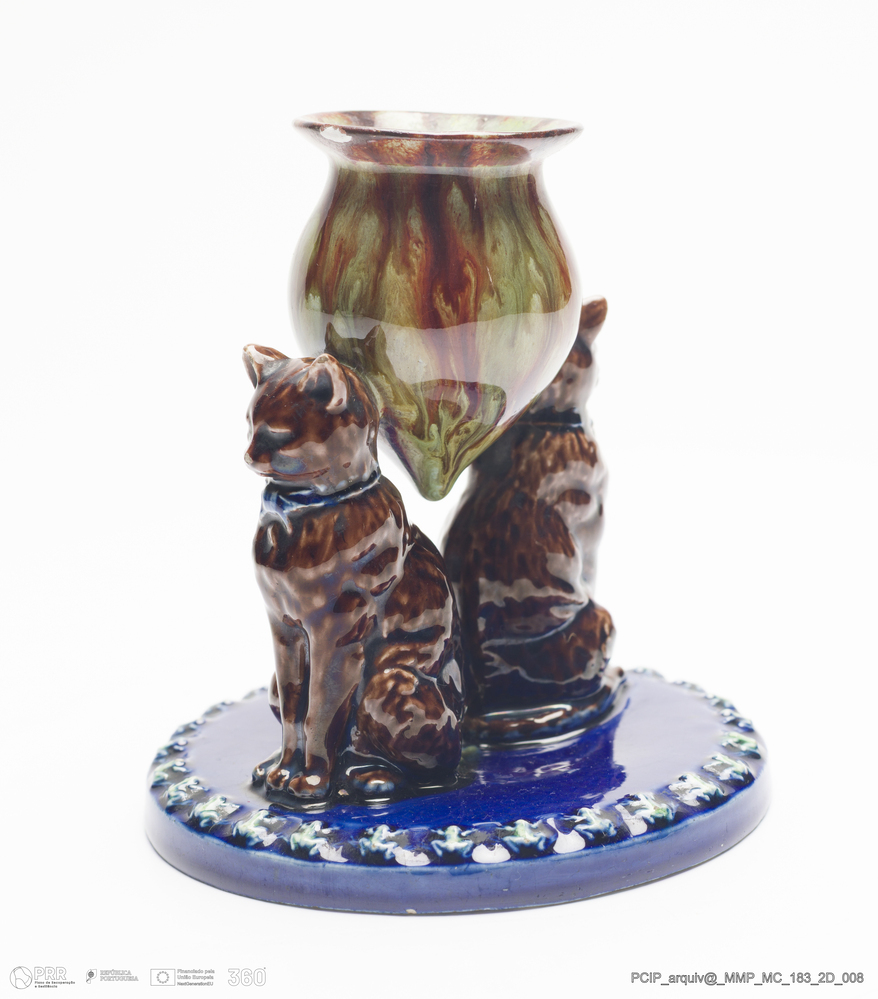Matéria/Técnica: Barro vermelho moldado. Vidrado polícromo: castanho escuro e mel, verde e azul; Cronologia: 1901; Autoria: Rafael Bordalo Pinheiro / Fábrica De Faianças das Caldas da Rainha, Portugal; Dimensões (cm): Altura: 12; Diâmetro: 12.