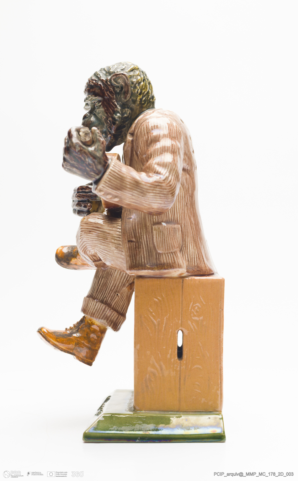 Matéria/Técnica: Barro vermelho moldado. Vidrado polícromo: castanho claro e mel, azul, laranja. Escorridos em castanho e verde; Cronologia: 1860-1893; Autoria: José Francisco de Sousa / Fábrica de José Francisco de Sousa, Caldas da Rainha, Portugal; Dimensões (cm): Altura: 23; Largura: 13,5; Comprimento: 13.