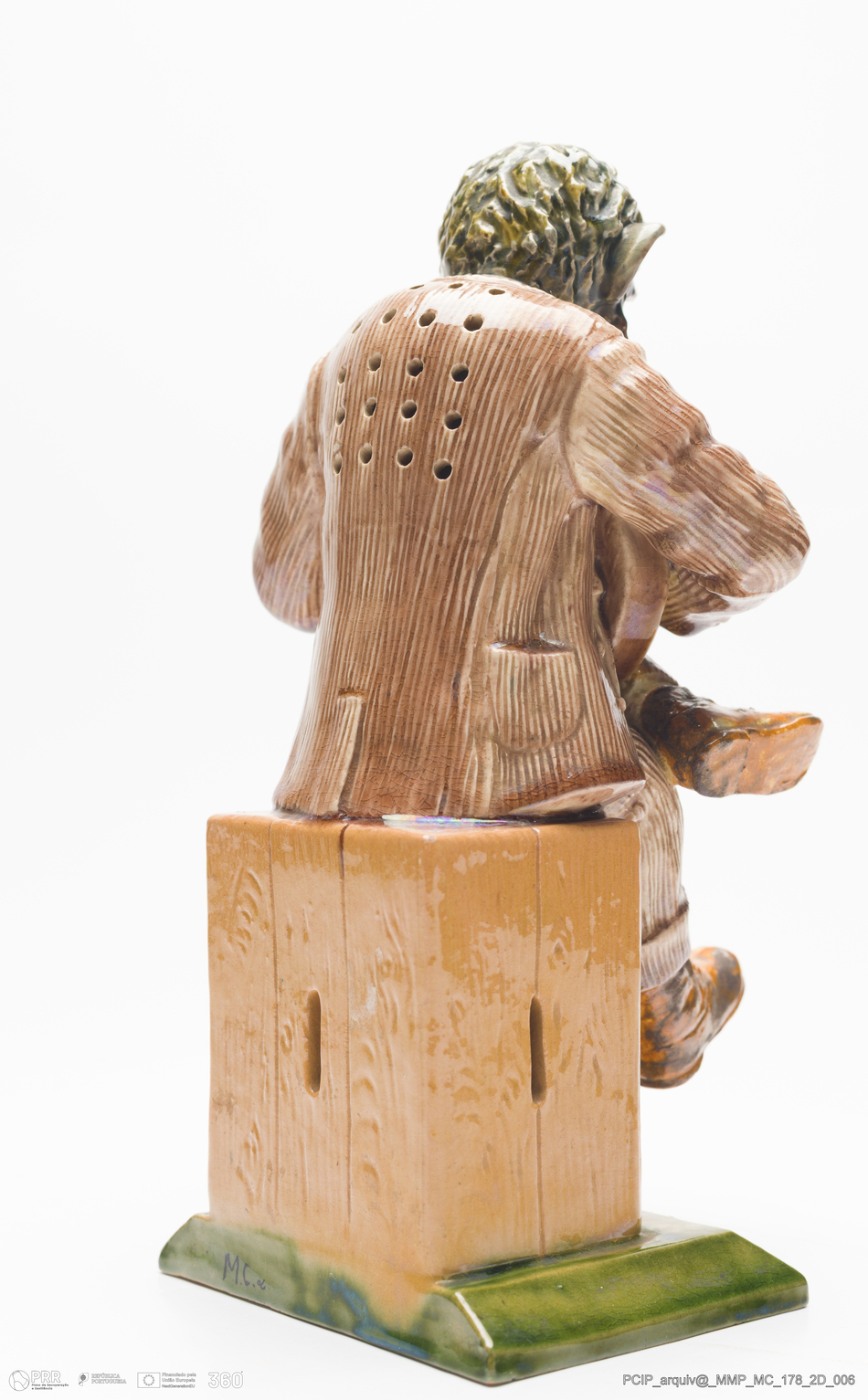 Matéria/Técnica: Barro vermelho moldado. Vidrado polícromo: castanho claro e mel, azul, laranja. Escorridos em castanho e verde; Cronologia: 1860-1893; Autoria: José Francisco de Sousa / Fábrica de José Francisco de Sousa, Caldas da Rainha, Portugal; Dimensões (cm): Altura: 23; Largura: 13,5; Comprimento: 13.