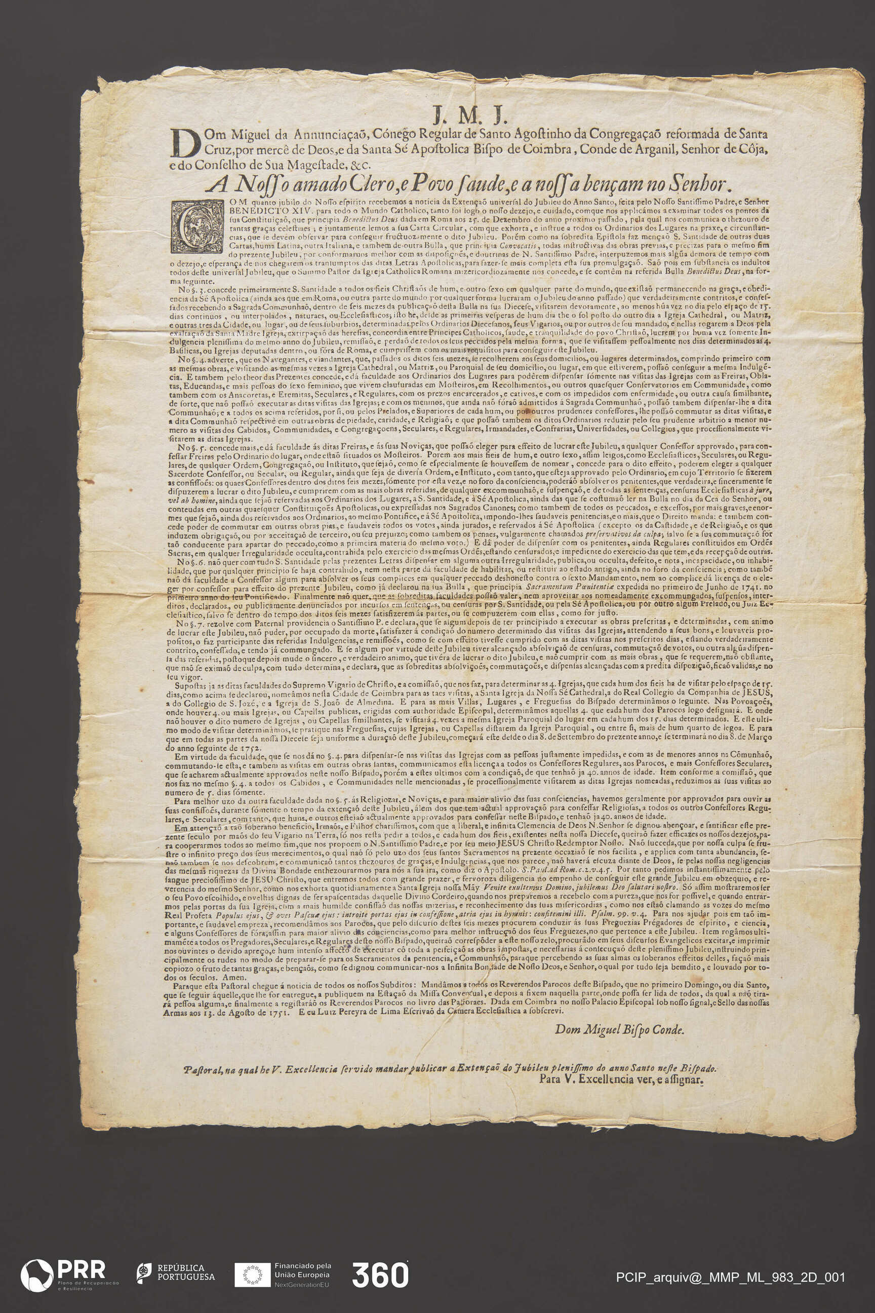 Matéria/Técnica: Impressão; Cronologia: 1751; Autoria: Anunciação, D. Miguel da - Bispo de Coimbra; Dimensões (cm): Altura: 49 x Largura: 36,5.
