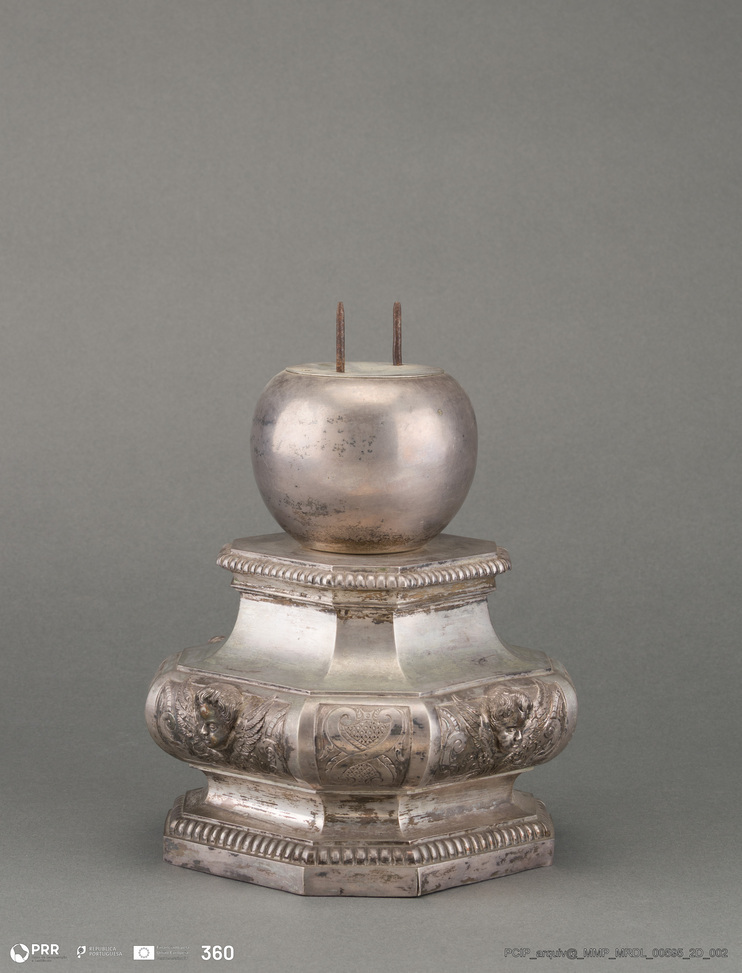 Matéria/Técnica: Prata e madeira; Cronologia: Desconhecida; Autoria: Desconhecida; Dimensões: Altura: 20,80 cm; Comprimento: 18,70 cm; Peso: 1.883,00 gr.