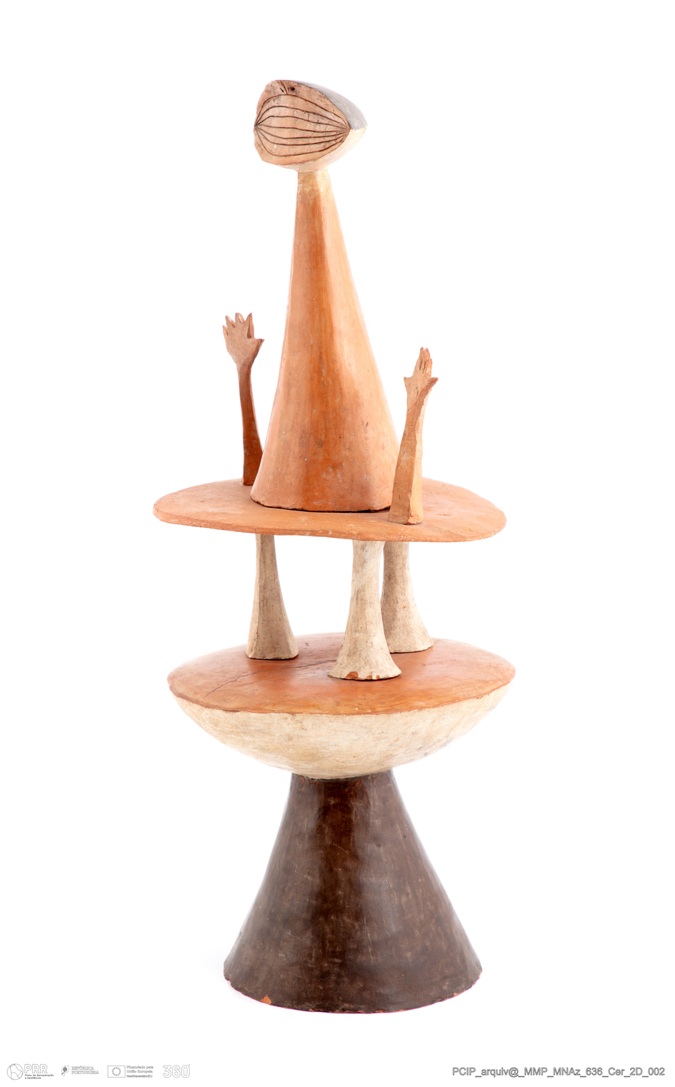 Matéria/Técnica: Engobe - técnica de pintura com argila líquida, corada com óxidos ou pigmentos, aplicada sobre o corpo cerâmico ainda cru. As peças podem ser apenas submetidas a uma única cozedura, mono cozedura, ou ser ainda cobertas com um vidrado fino e transparente; Cronologia: 1955; Autoria: Vieira, Jorge Ricardo da Conceição; Dimensões: Altura: 38 cm x Diâmetro: 15 cm.