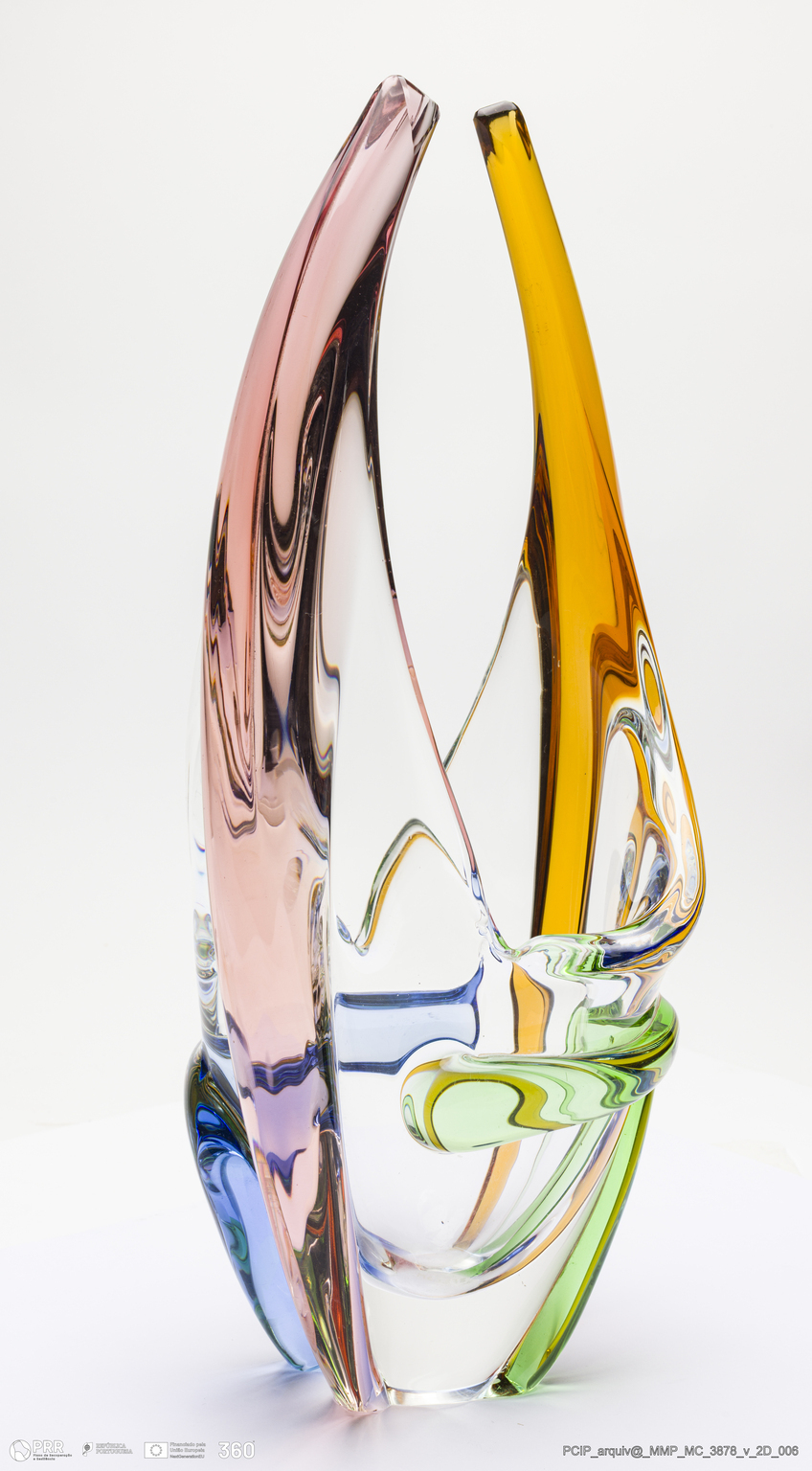 Matéria/Técnica: Vidro transparente com azul, verde, salmão e amarelo; Cronologia: século XX; Autoria: Desconhecido / Murano, Itália; Dimensões (cm): Altura: 36,5; Largura: 15; Comprimento: 20.