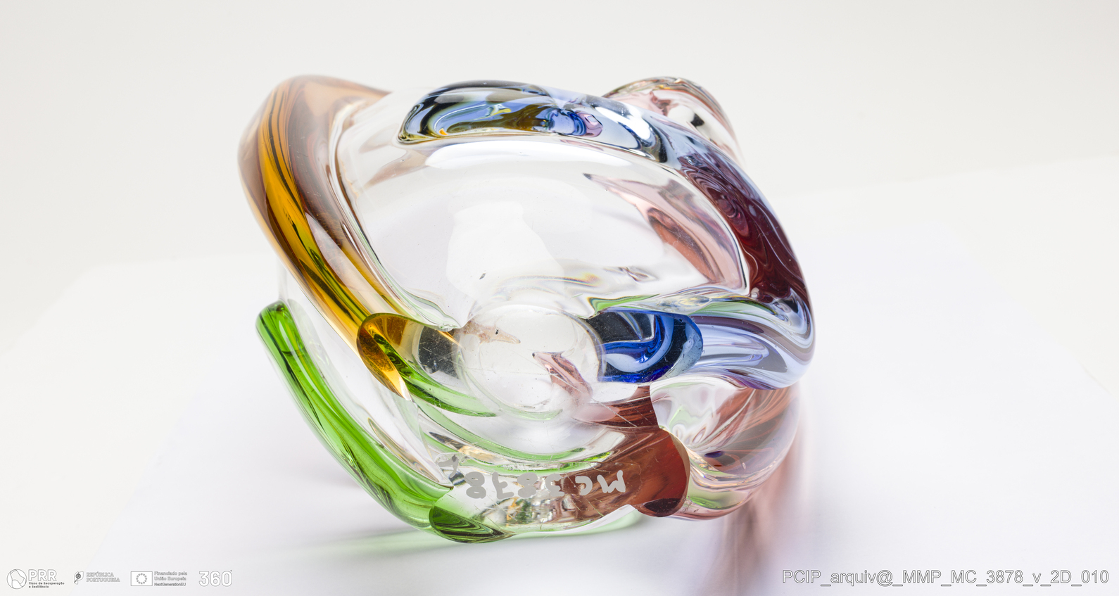 Matéria/Técnica: Vidro transparente com azul, verde, salmão e amarelo; Cronologia: século XX; Autoria: Desconhecido / Murano, Itália; Dimensões (cm): Altura: 36,5; Largura: 15; Comprimento: 20.
