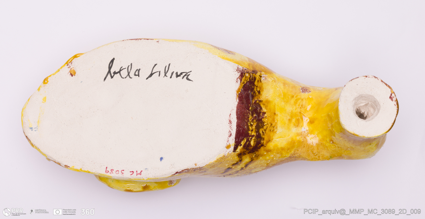 Matéria/Técnica: Grés modelado. Vidrado amarelo ferro; Cronologia: 2001; Autoria: Bela Silva / Atelier de Bela Silva, Lisboa, Portugal; Dimensões (cm): Altura: 10; Largura: 30; Comprimento: 15.