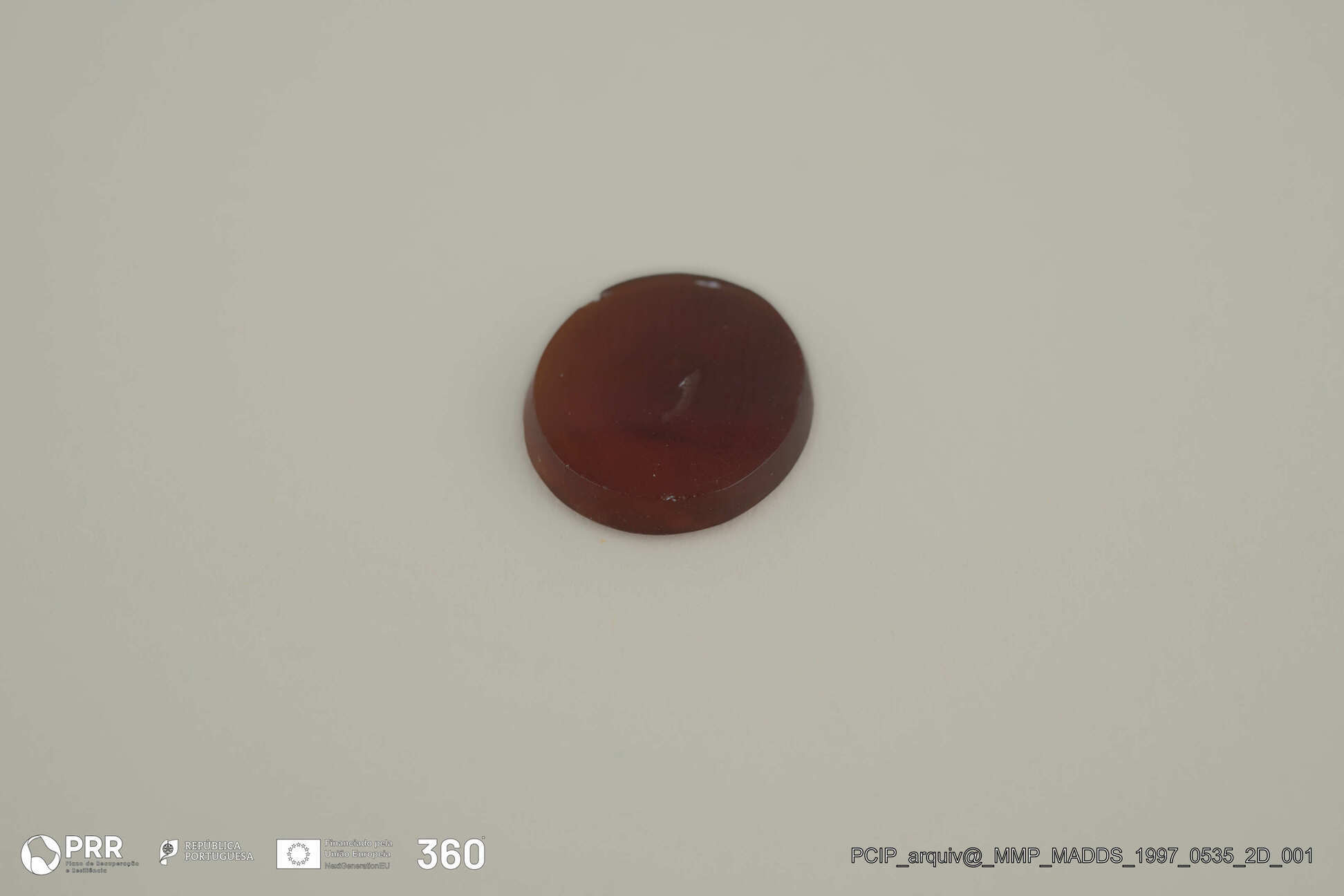 Matéria/Técnica: Calcedónia; Cronologia: Século I; Autoria: Desconhecida; Dimensões (cm): 1,3 x 1,19 x 0,25.