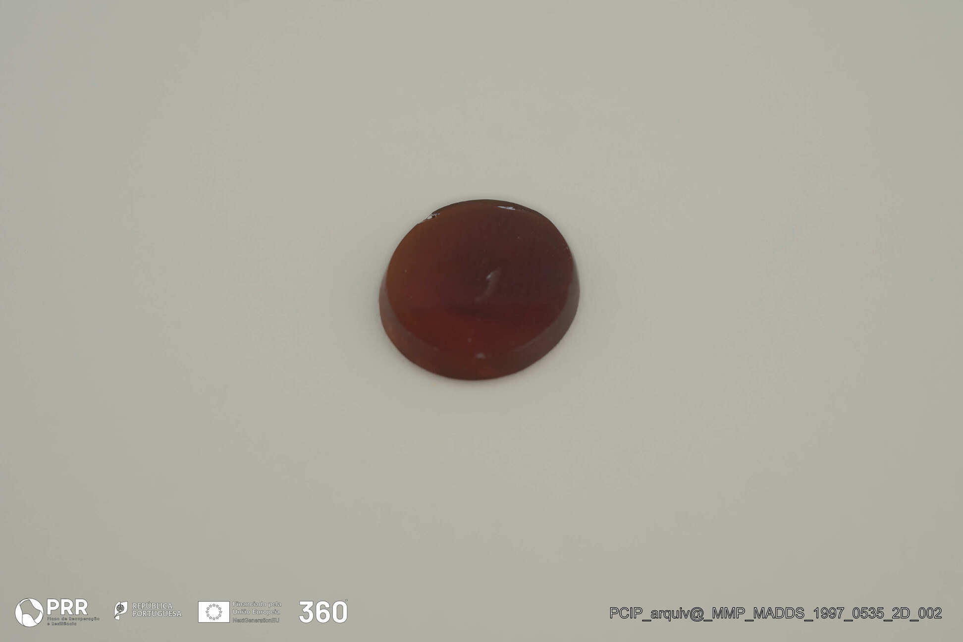 Matéria/Técnica: Calcedónia; Cronologia: Século I; Autoria: Desconhecida; Dimensões (cm): 1,3 x 1,19 x 0,25.