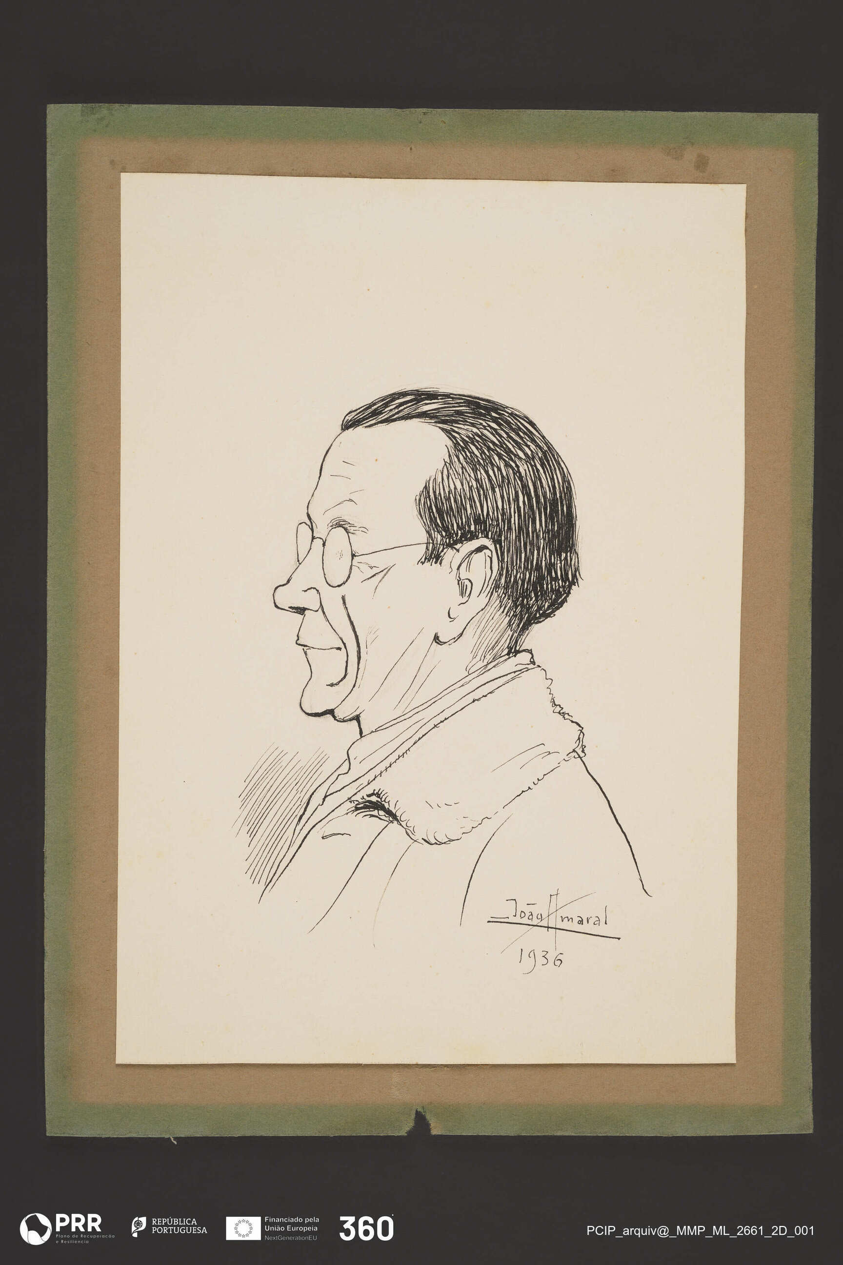 Matéria/Técnica: Desenho à pena; Cronologia: 1936; Autoria: Amaral, João (1874 - 1955); Dimensões (cm): Altura: 21,6 x Largura: 14,5.