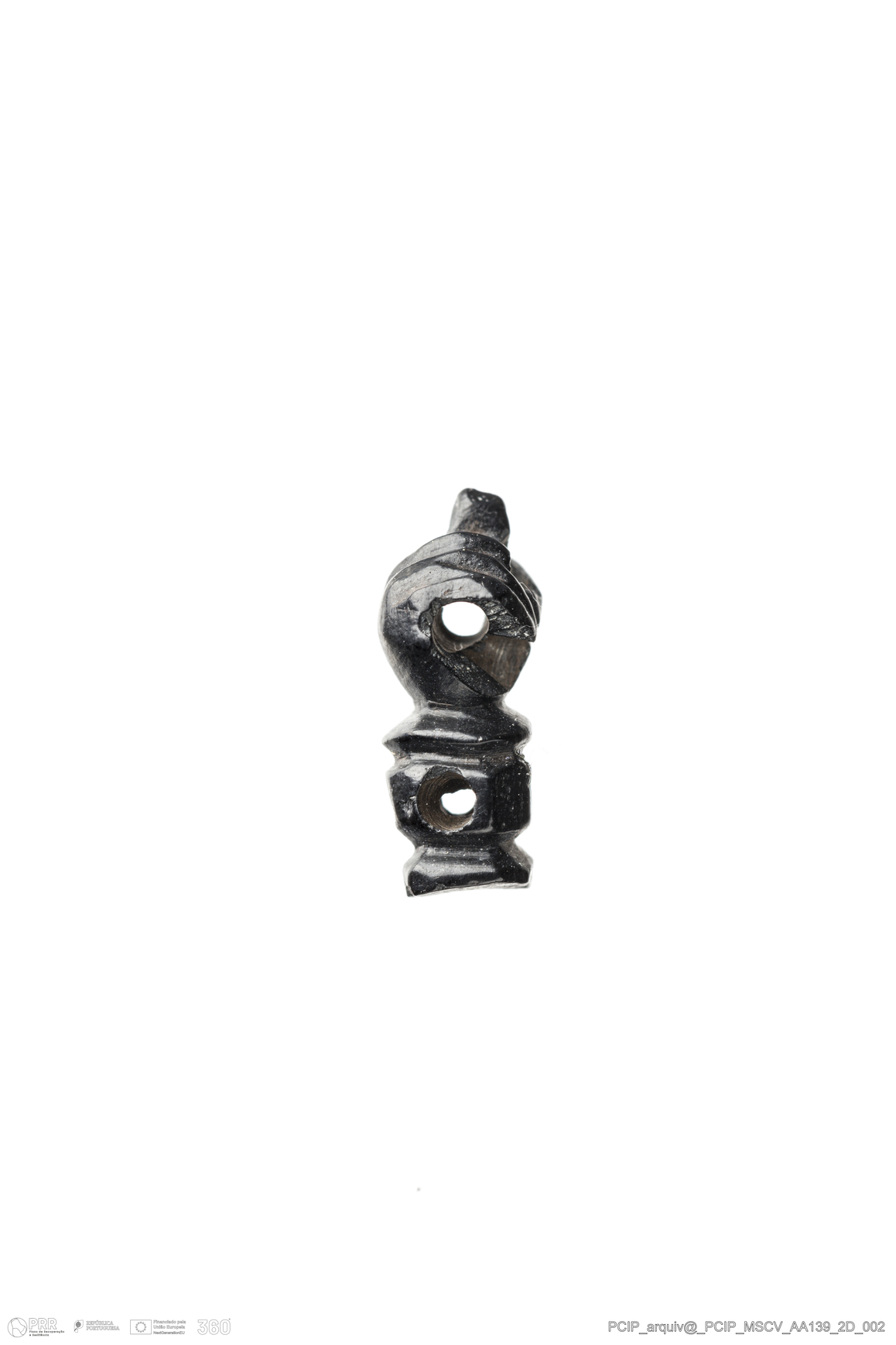 Matéria/Técnica: Azeviche; Cronologia: Século XVI-XVII; Autoria: Desconhecida; Dimensões: Largura: 19mm Altura / Espessura: 19mm Comprimento / Profundidade: 39 mm.