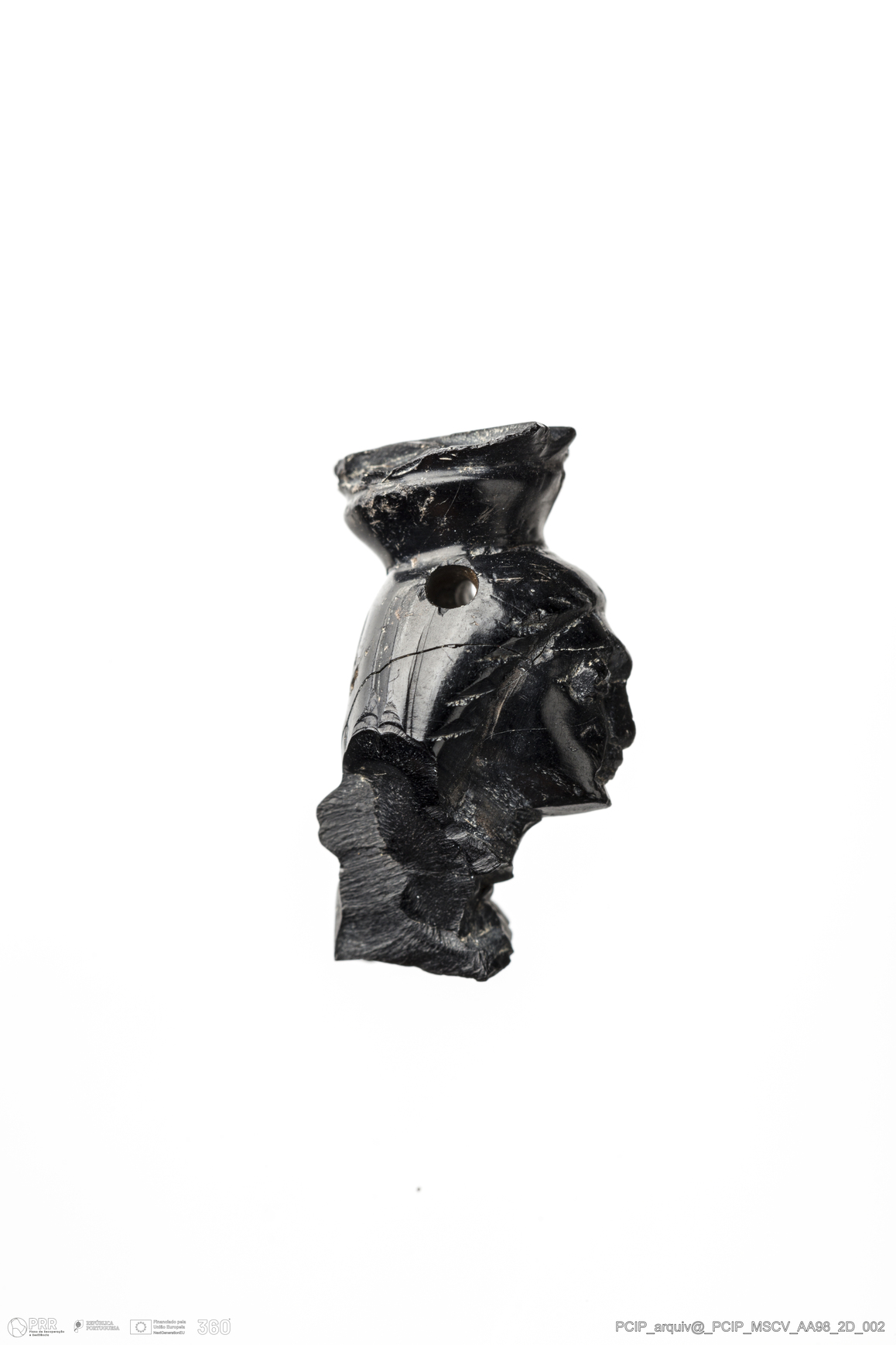Matéria/Técnica: Azeviche; Cronologia: Século XVI-XVII; Autoria: Desconhecida; Dimensões: Largura: 8mm Altura / Espessura: 11mm Comprimento / Profundidade:18 mm.