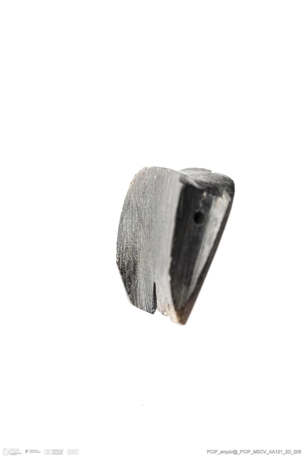Matéria/Técnica: Osso ?; Cronologia: Século XVI-Século XVII; Autoria: Desconhecida; Dimensões: Comprimento: 12mm; Largura: 15,5mm; Espessura: 7mm.