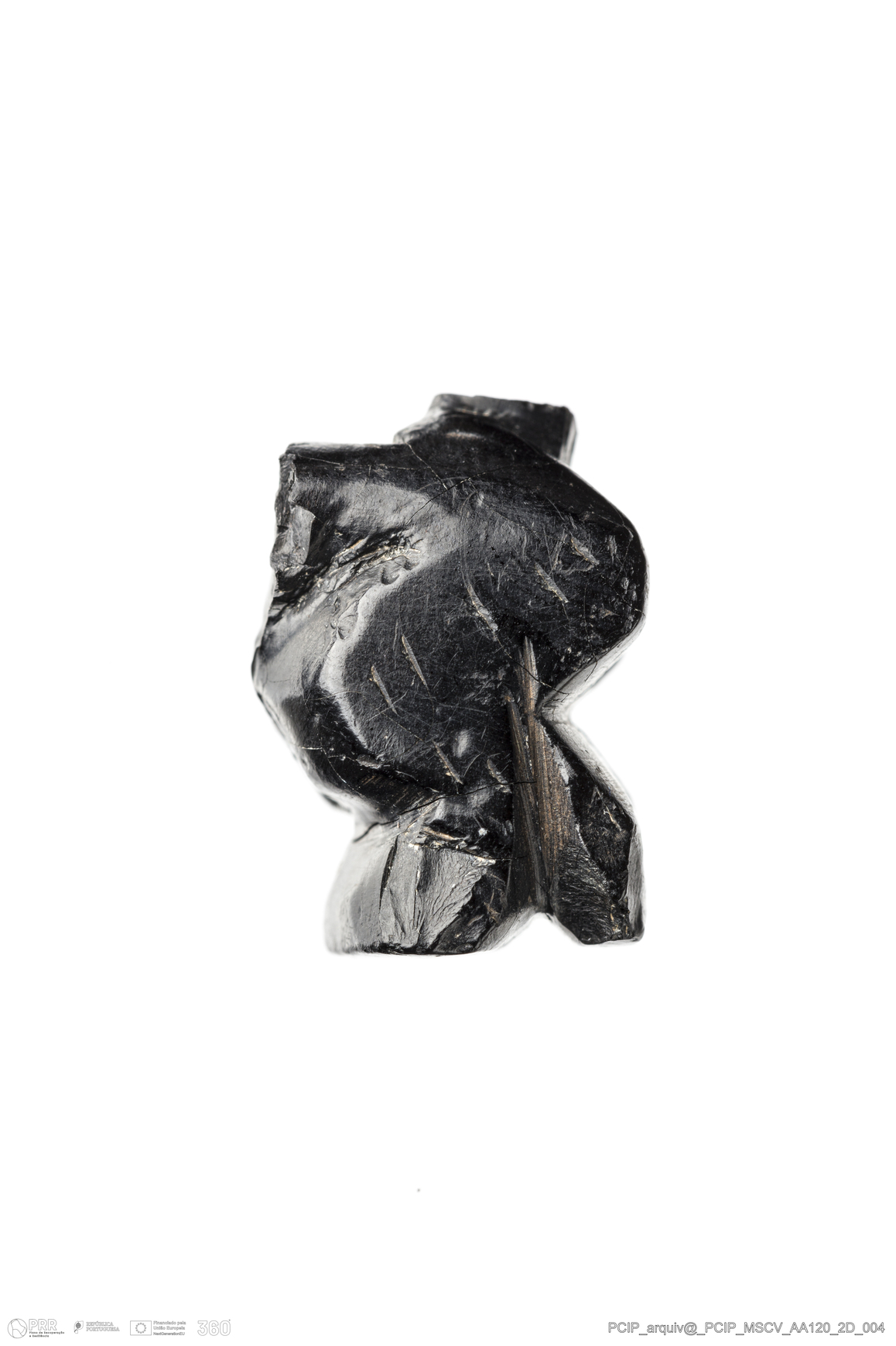 Matéria/Técnica: Azeviche; Cronologia: Século XVI-Século XVII; Autoria: Desconhecida; Dimensões: Comprimento: 20mm; largura: 15mm; Espessura: 13mm.