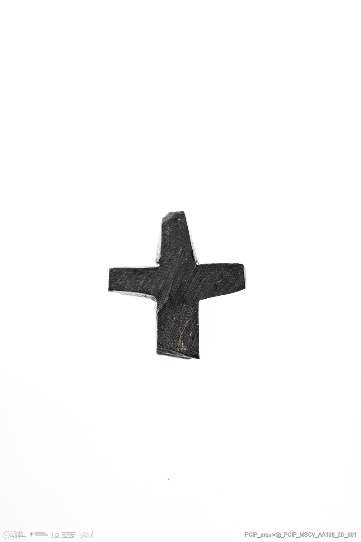 Matéria/Técnica: Azeviche; Cronologia: Século XVI-XVII; Autoria: Desconhecida; Dimensões: Largura: 11mm; Comprimento: 12mm; Espessura: 4mm .