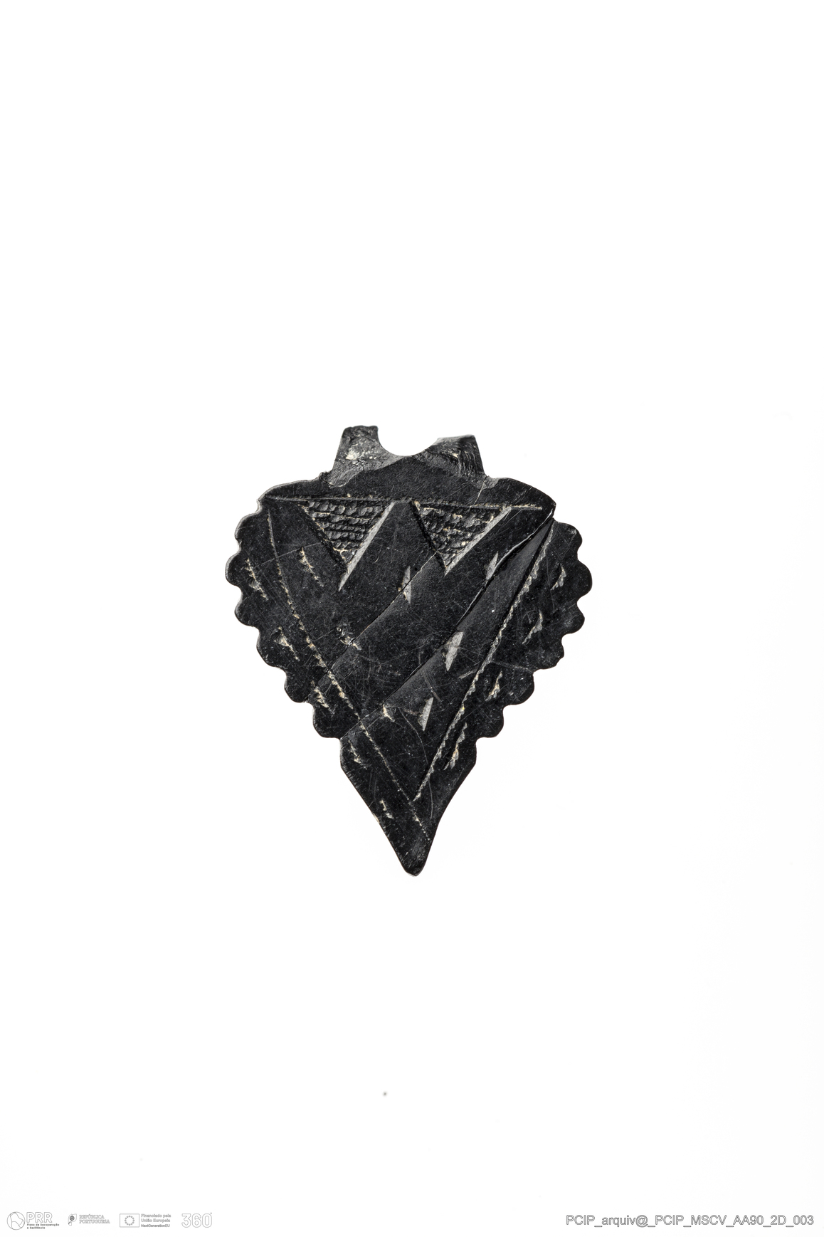 Matéria/Técnica: Azeviche; Cronologia: Século XVI-XVII; Autoria: Desconhecida; Dimensões: Largura: 13mm; Comprimento: 15mm; Espessura: 3mm .
