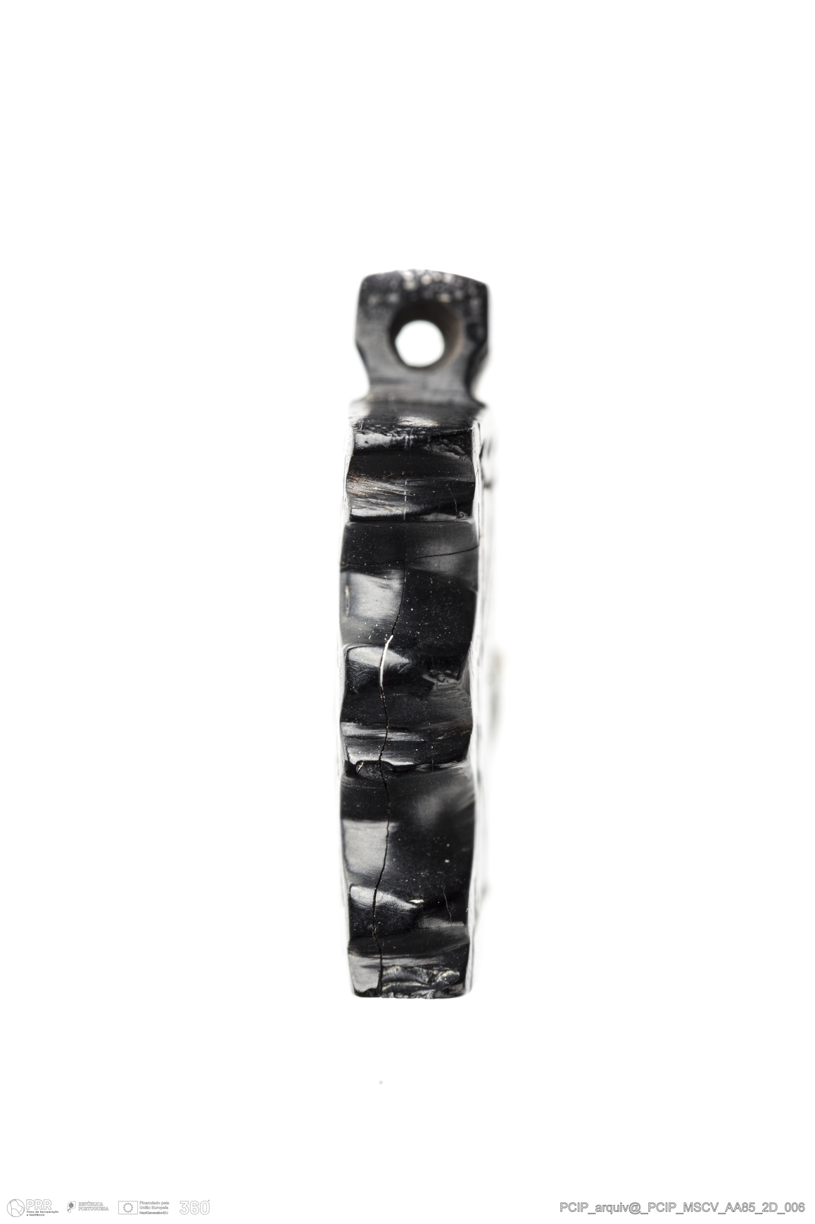 Matéria/Técnica: Azeviche; Cronologia: Século XVI-XVII; Autoria: Desconhecida; Dimensões: Largura: 18mm Altura / Espessura:5 mm Comprimento / Profundidade: 25mm.