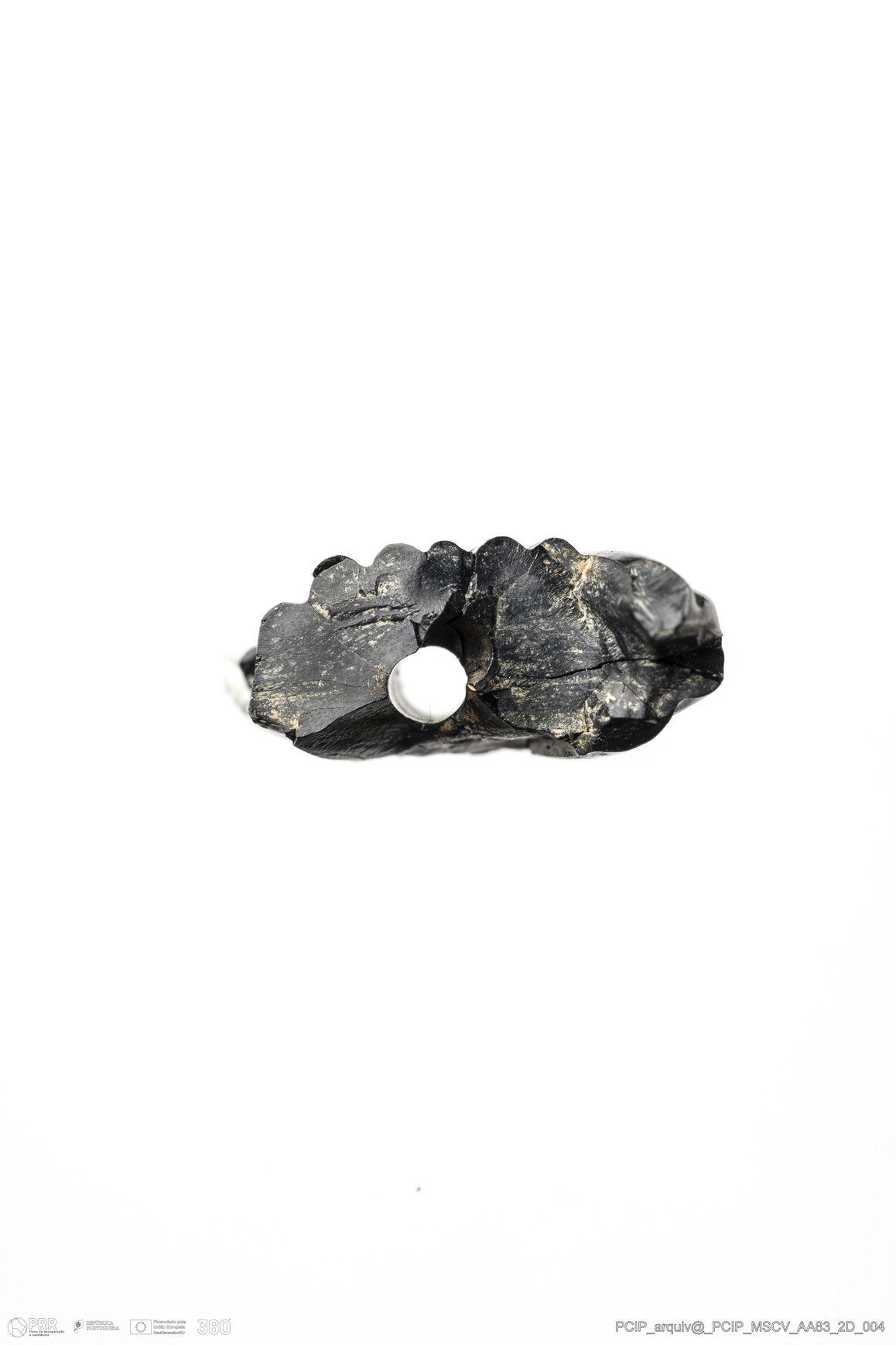 Matéria/Técnica: Azeviche; Cronologia: Século XVI-XVII; Autoria: Desconhecida; Dimensões: Largura: 14mm; Comprimento: 16mm; Espessura: 7mm .