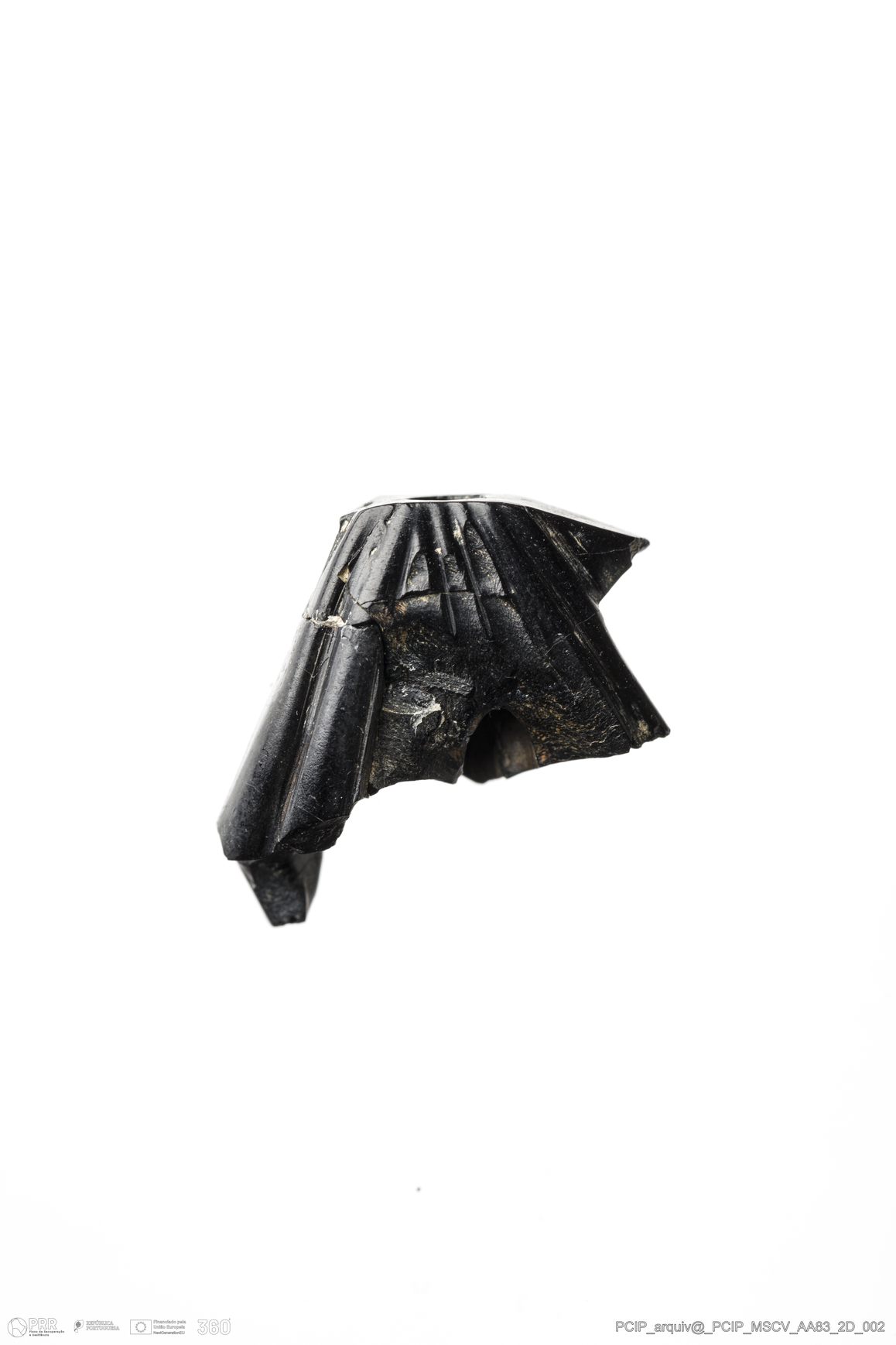 Matéria/Técnica: Azeviche; Cronologia: Século XVI-XVII; Autoria: Desconhecida; Dimensões: Largura: 14mm; Comprimento: 16mm; Espessura: 7mm .