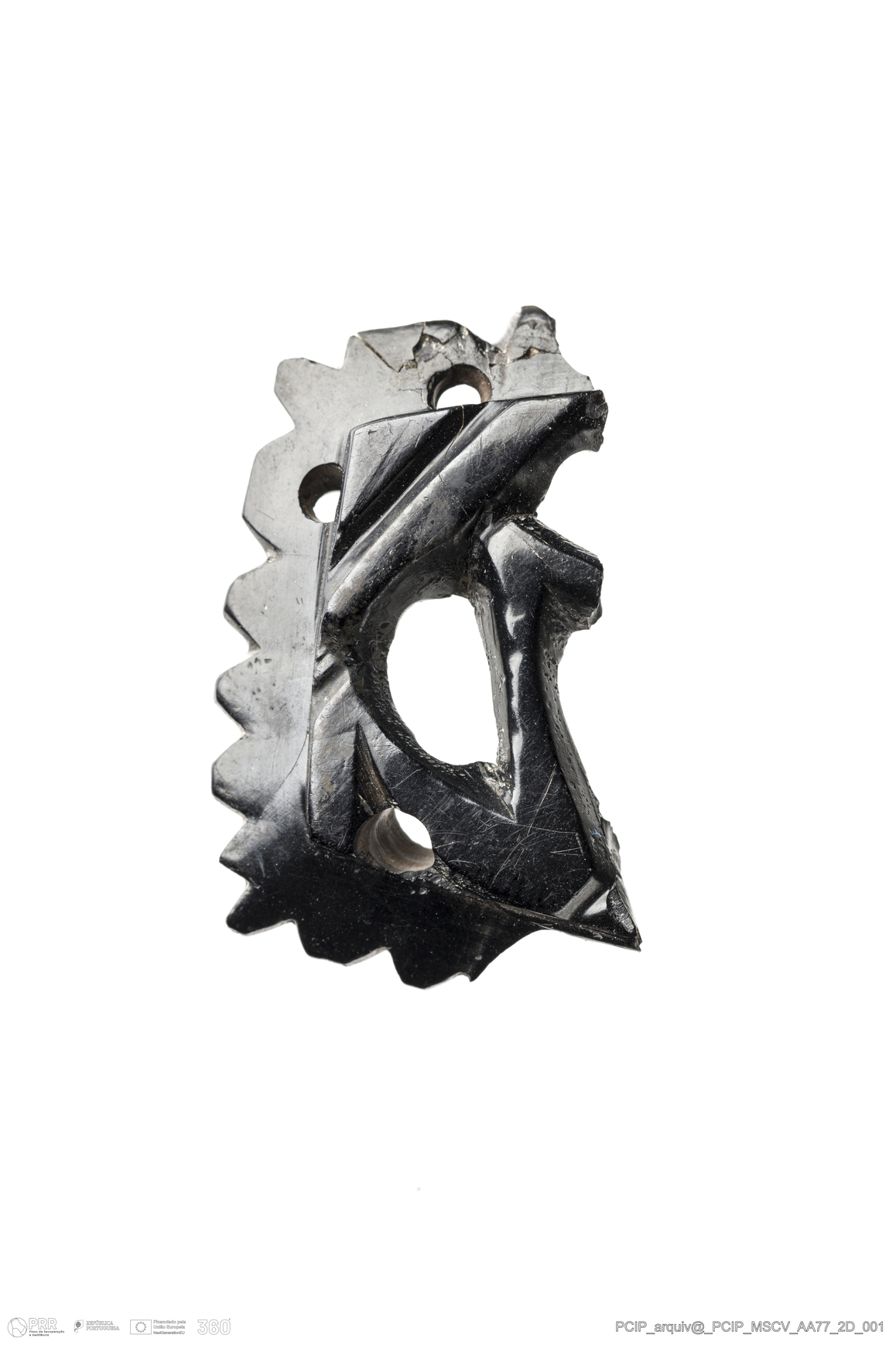 Matéria/Técnica: Azeviche; Cronologia: Século XVI-XVII; Autoria: Desconhecida; Dimensões: Largura: 37mm Altura / Espessura: 33mm .