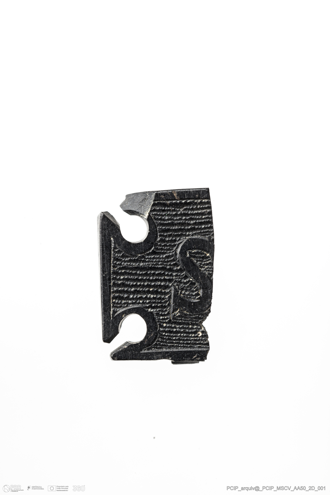 Matéria/Técnica: Azeviche; Cronologia: Século XVI-XVII; Autoria: Desconhecida; Dimensões: Largura: 9mm; Comprimento: 14mm; Espessura: 2mm .