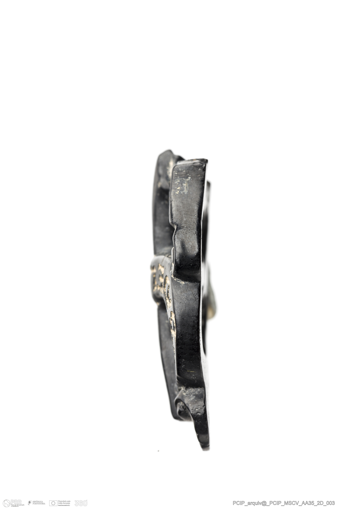 Matéria/Técnica: Azeviche; Cronologia: Século XVI-XVII; Autoria: Desconhecida; Dimensões: Largura: 23mm Altura /Espessura: 6mm Comprimento/ Profundidade: 35mm.