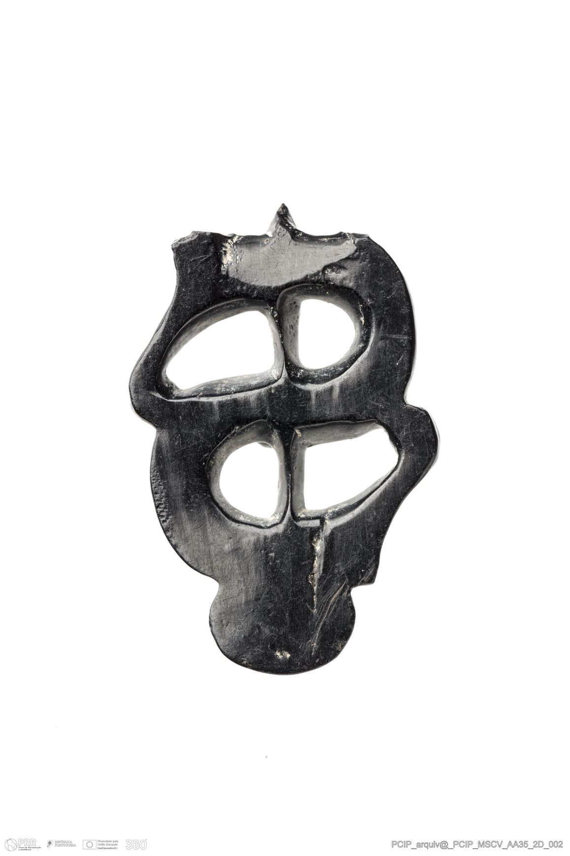 Matéria/Técnica: Azeviche; Cronologia: Século XVI-XVII; Autoria: Desconhecida; Dimensões: Largura: 23mm Altura /Espessura: 6mm Comprimento/ Profundidade: 35mm.