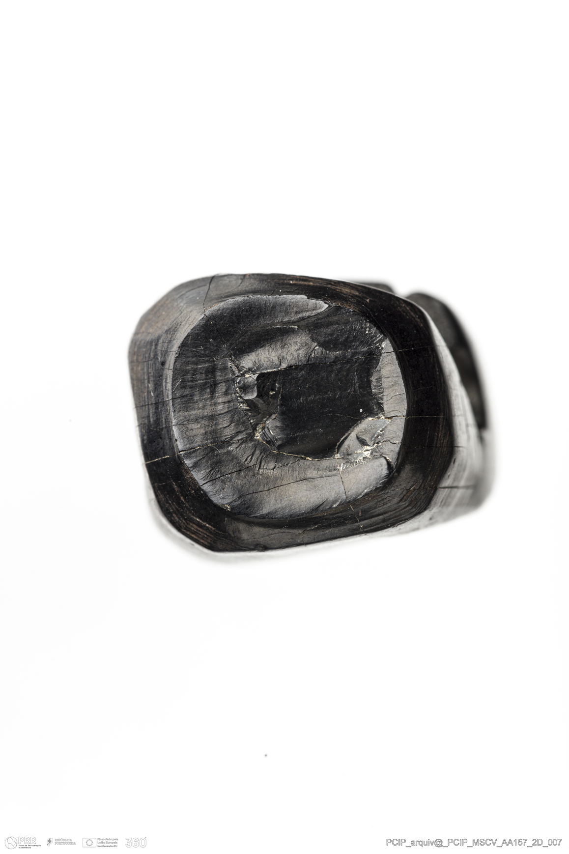 Matéria/Técnica: Azeviche; Cronologia: Século XVI-XVII; Autoria: Desconhecida; Dimensões: Largura: 18mm Altura / Espessura: 14mm Comprimento / Profundidade:22mm.