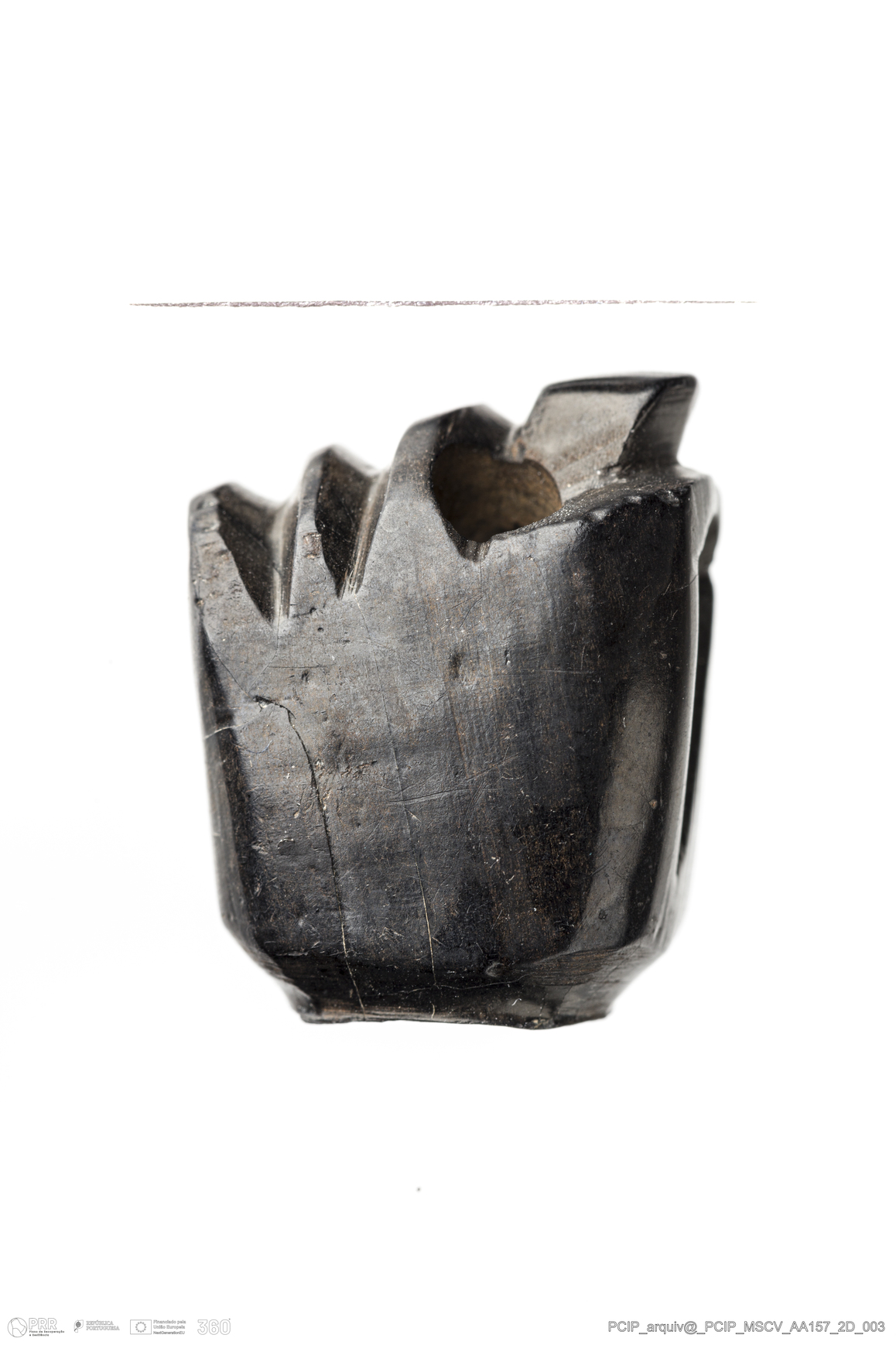 Matéria/Técnica: Azeviche; Cronologia: Século XVI-XVII; Autoria: Desconhecida; Dimensões: Largura: 18mm Altura / Espessura: 14mm Comprimento / Profundidade:22mm.