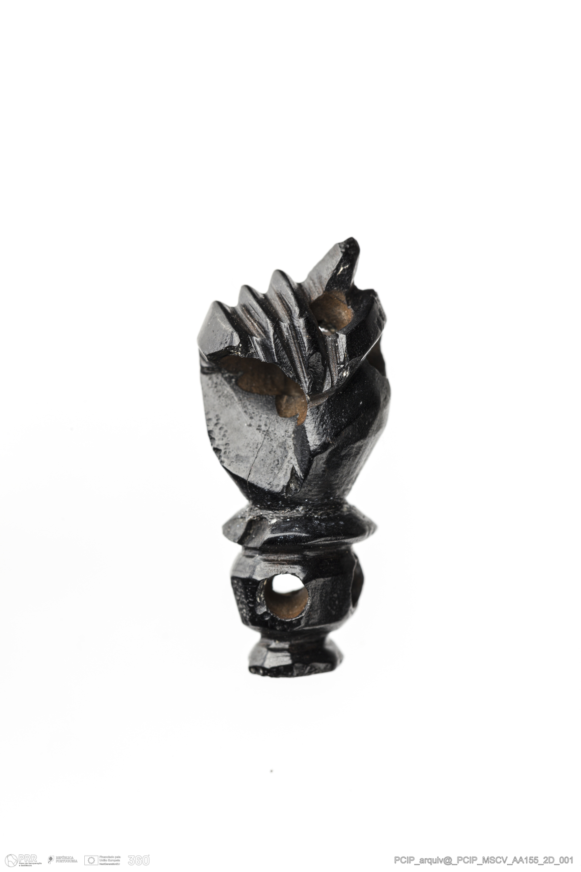 Matéria/Técnica: Azeviche; Cronologia: Século XVI-XVII; Autoria: Desconhecida; Dimensões: Largura: 10mm Altura / Espessura: 8mm Comprimento / Profundidade: 22mm.