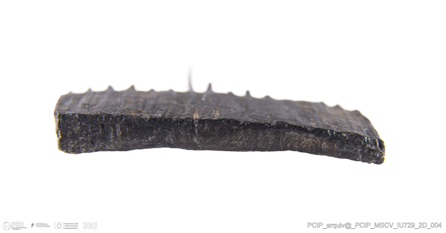Matéria/Técnica: Madeira; Cronologia: Século XVII; Autoria: Desconhecida; Dimensões: Altura: 26mm; Comprimento: 35,5mm; Espessura: 5mm.
