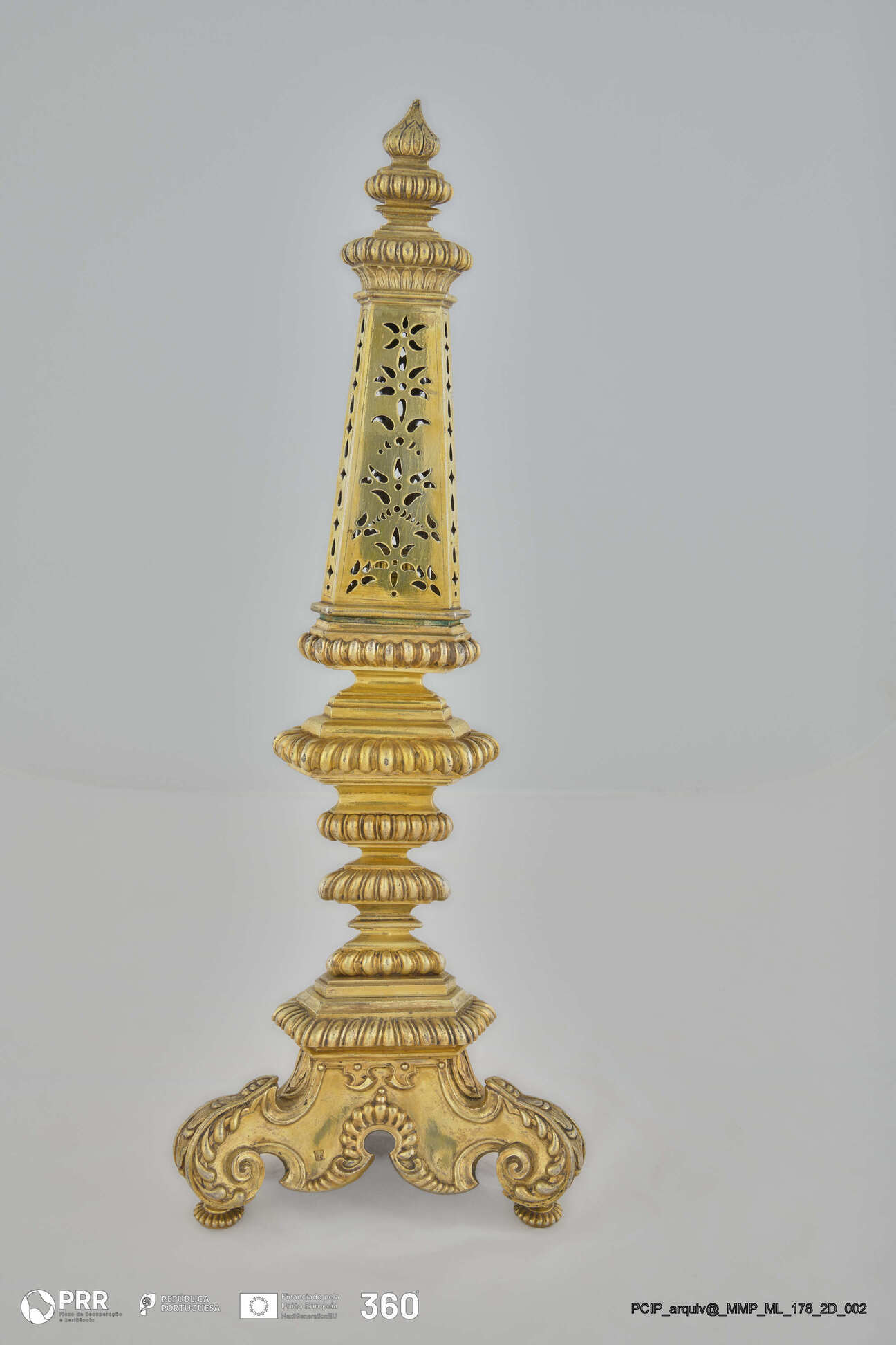 Matéria/Técnica: Dourada, relevada, cinzelada e vazada; Cronologia: Desconhecida; Autoria: Desconhecida; Dimensões: Desconhecidas.