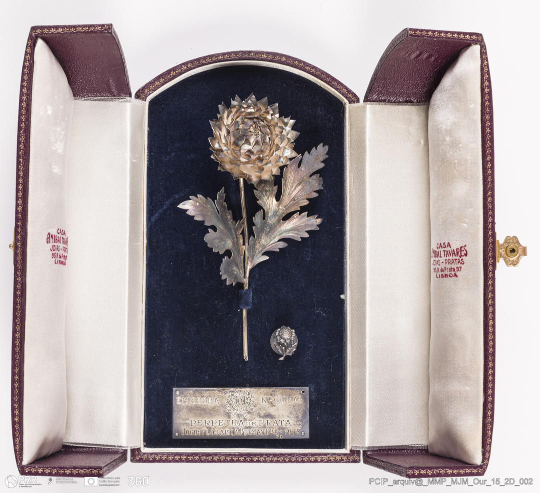 Matéria/Técnica: Folha de prata; Cronologia: 1938; Autoria: Desconhecida; Dimensões: alcachofra Altura: 14 - botão Diâmetro: 1,5 cm.